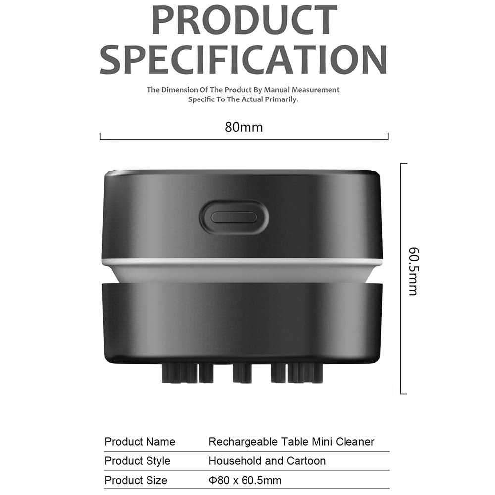 - High Suction and Low NoiseWith 1000Pa of suction power, Table Vacuum Cleaner is strong enough to pick up even the largest piles. Yet, it is quiet enough for you to read or sleep while it cleans. Our cordless dust catcher save you from the mess of paper scrap, daily dust, cigarette ash, dog hair or powder on the desk. The table cleaner spins at up to 9000 rpm compared to 6000 rpm of other cleaner. It generates the suction power of a vacuum.