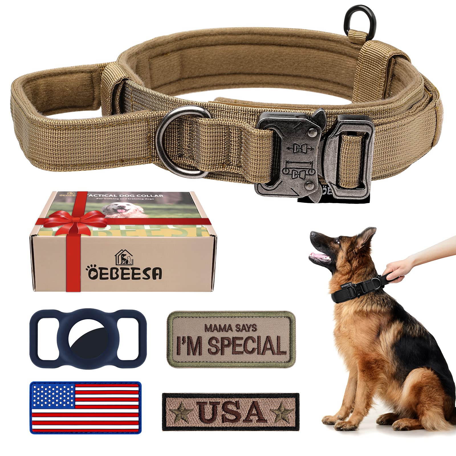 - Original Basic Collars – Tactical Dog Collar Adjustable Military Collar: - Nylon K9 Collars with Handle and Heavy Duty Metal Buckle for Medium Dogs with 3 Patches and Airtag Case Holder (M, Brown) by OEBEESA