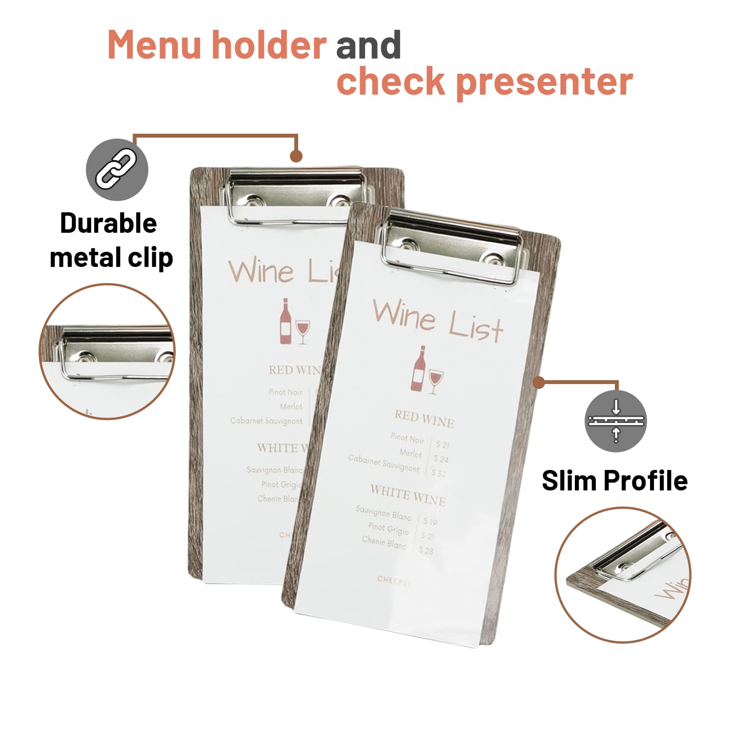 - DURABLE METAL CLIP - Check presenter has metal clip which makes it easy to secure checks, bills, menus, wine lists, and daily specials to the wood menu holder.