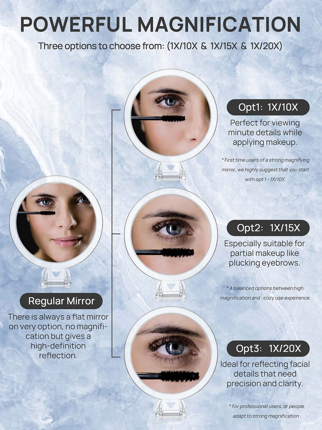 - Powerful Magnification - The 20X magnifying Mirror works excellent for applying eyeliner or mascara, lining and defining the eyebrows, putting on contact lenses, and other beauty and skincare needs. If the 20X is too powerful for you, the 10X and 15X will also be a good choice.