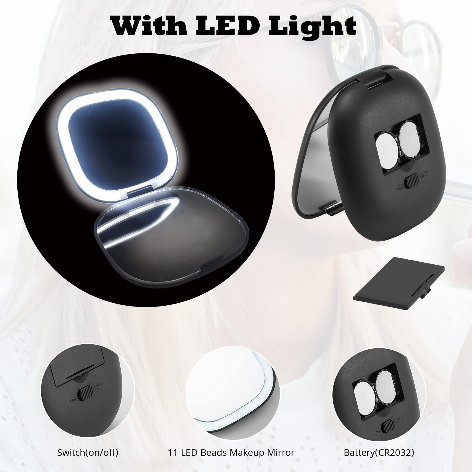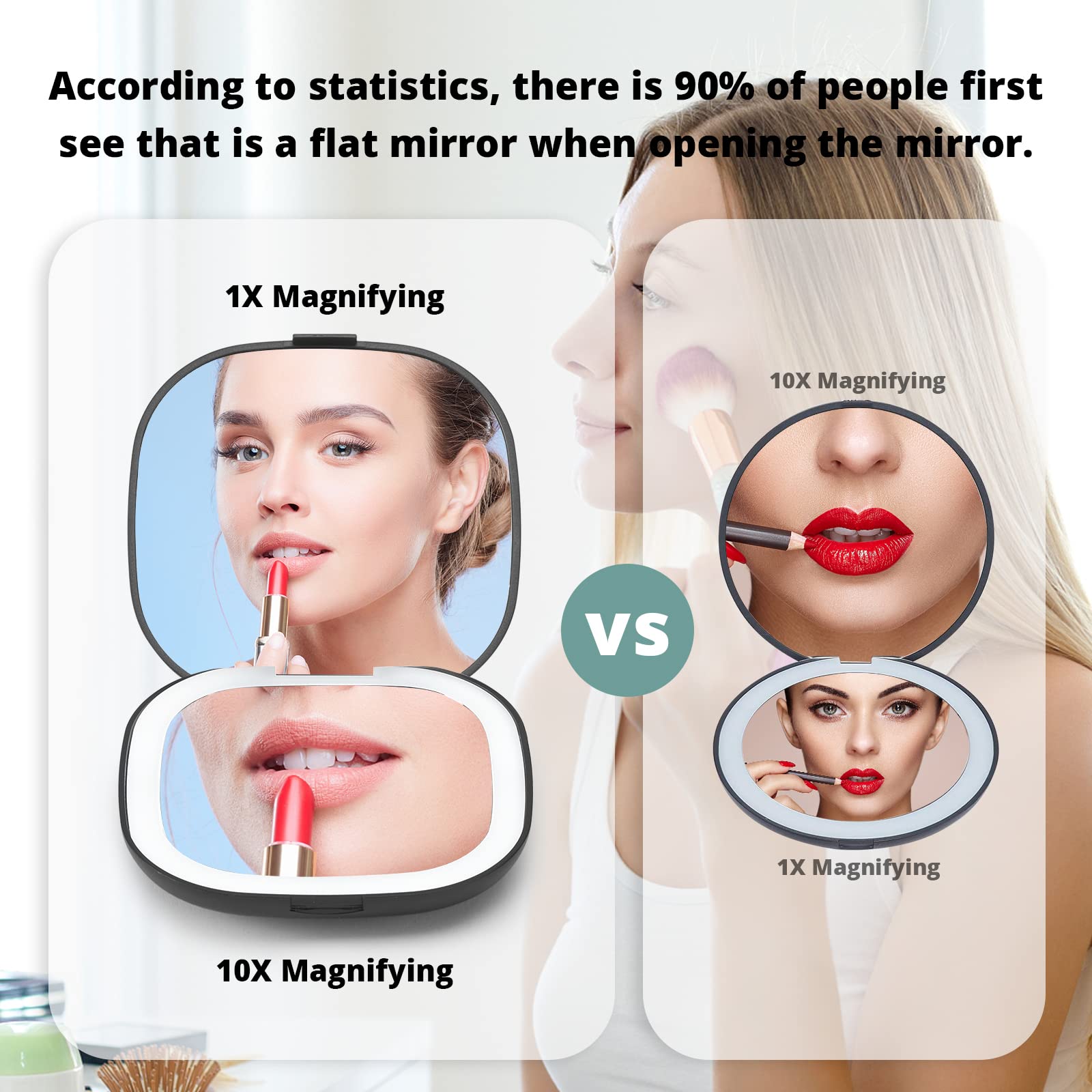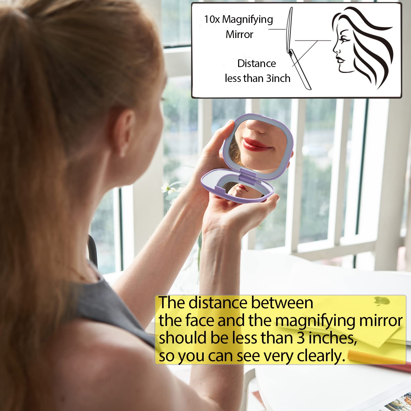 - 1x and 10x Magnifying Mirror with LightUpon opening the makeup mirror, you are greeted with a regular 1x mirror that provides a full-face view for easy makeup application. And the 10x magnifying mirror allows for effortless precision during facial treatments such as deep cleansing, eyebrow plucking, blackhead removal, and even while wearing contact lenses. Please note: for optimal visual clarity, ensure the distance between your face and the magnifying mirror is less than 3 inches.