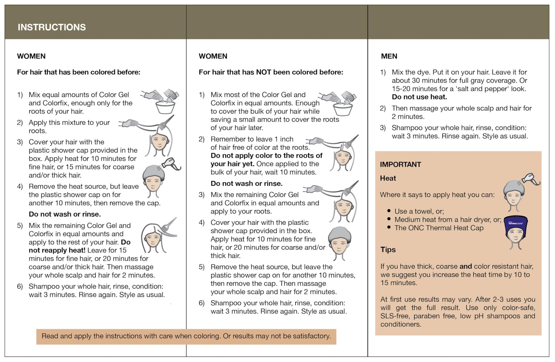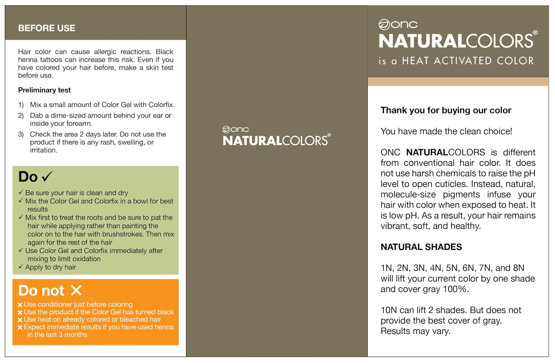 - INCLUDES: ONC NATURALCOLORS comes with Color Gel, Colorfix (developer) Plastic gloves and shower cap, low ph non paraben sulphate free shampoo and conditioner and easy to use instructions.