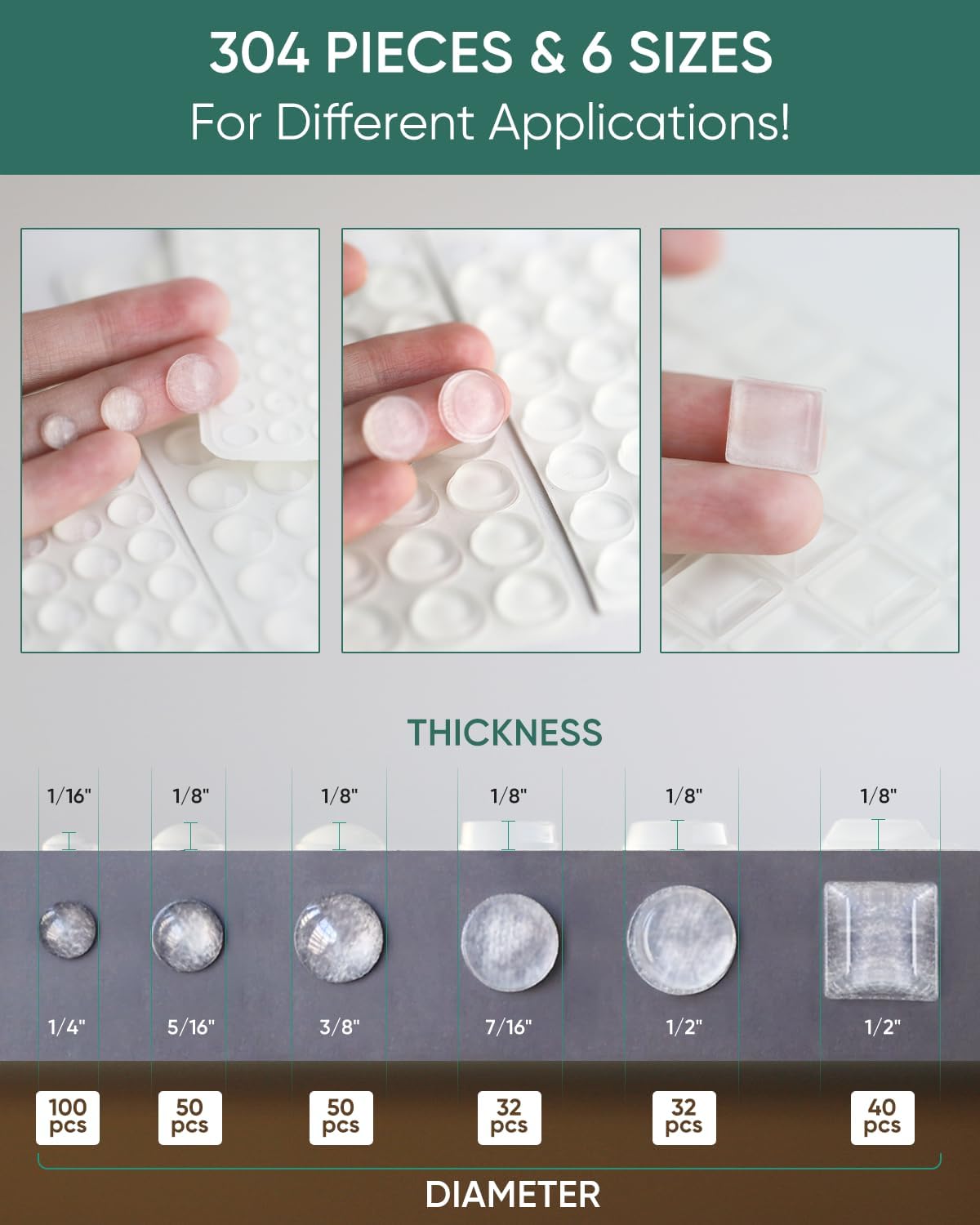 - 304 Pcs Cabinet Door Bumper: Includes Cylindrical, Hemispherical and Trapezoid shaped rubber feet. Nice variety of clear bumper pads, you will always find the perfect size to use on your house projects