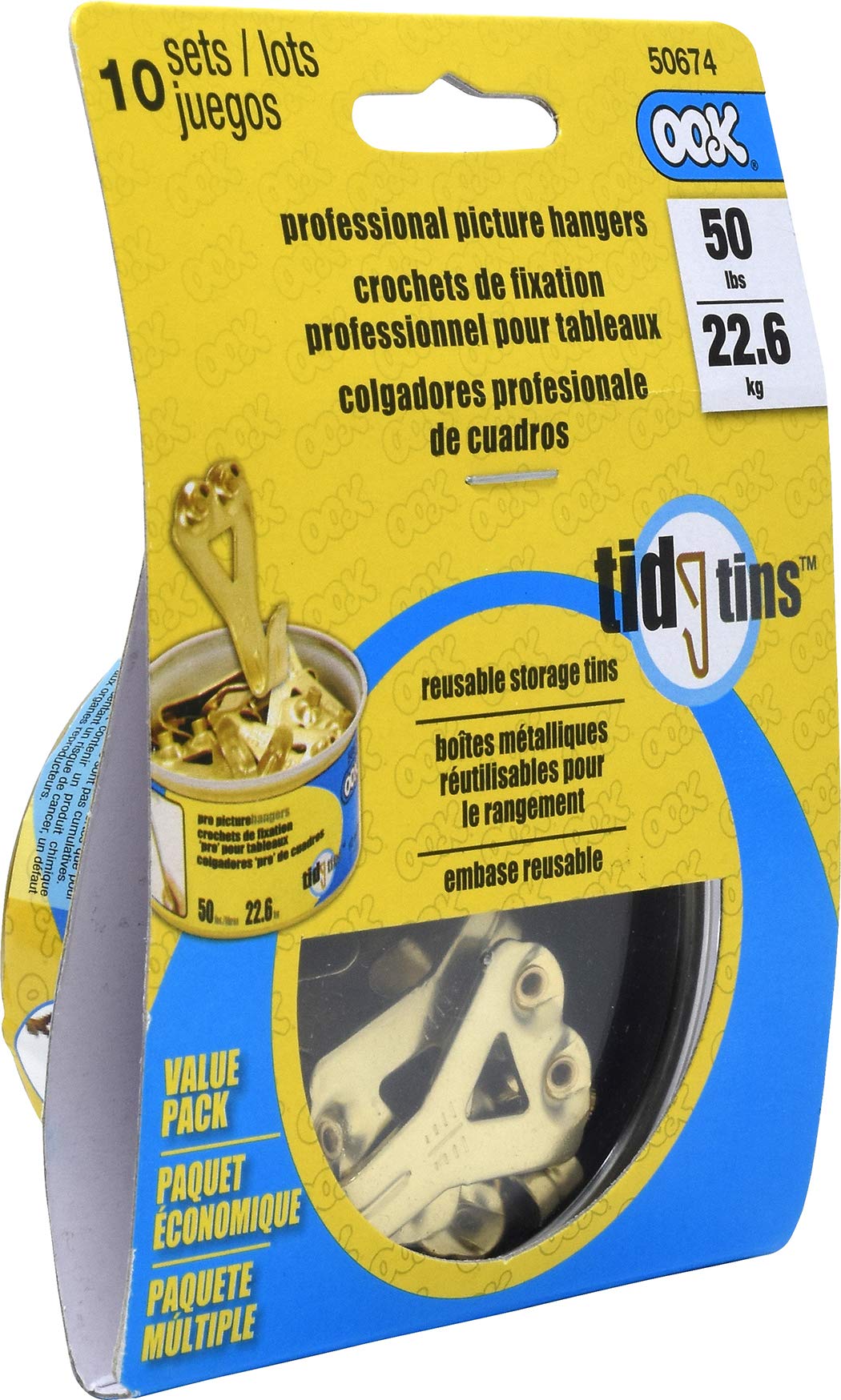 - HANGS 10 ITEMS: TidyTin contains 10 professional picture hangers with nails, each with a weight rating of 50lbs