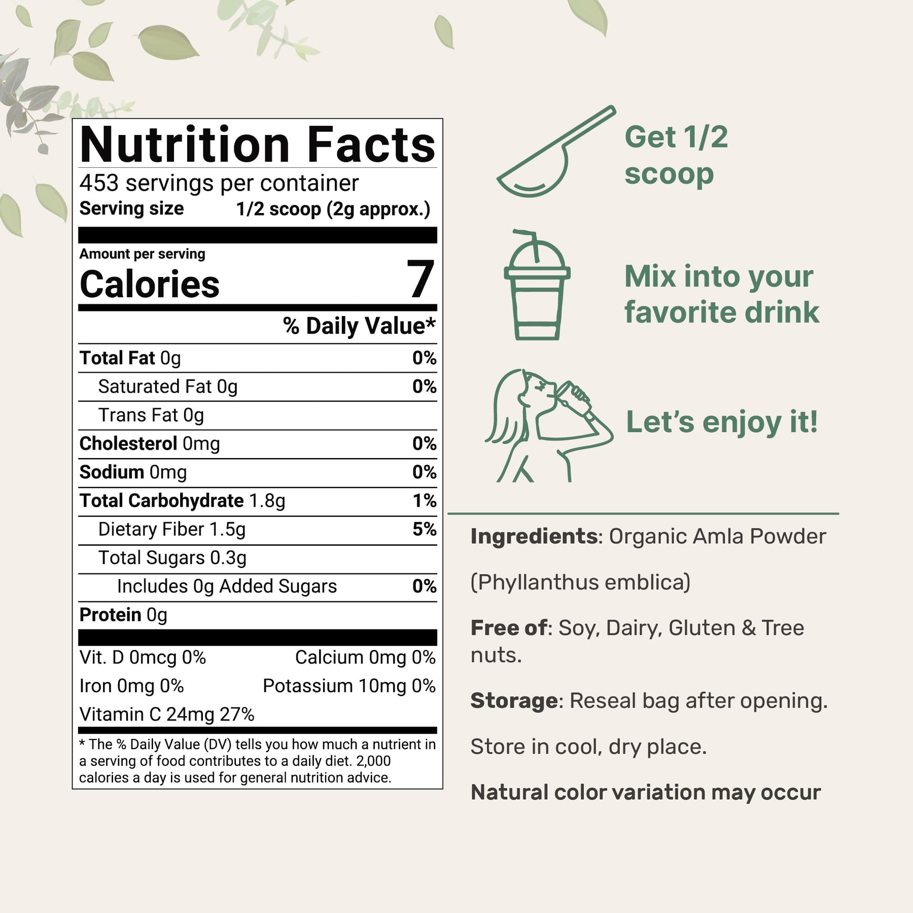- Each pouch provides 2 lbs of traditional vegan amla (Amalaki) powder as Phyllanthus Emblica. This equals a 453-day supply with every ½ scoop equaling 2g of fresh amla.