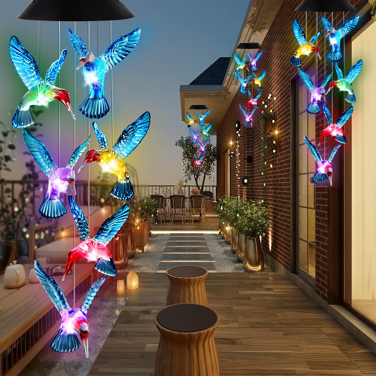 - Solar Hummingbird Wind Chime Outdoor Color Changing : The magical wind chimes solar powered with 7 color changing when lights on. At night, they will shine in wonderful colors, red, yellow, green, orange, purple, red and blue. (Valentine's day Gifts, GIFTS FOR MOM,BIRTHDAY GIFTS FOR MOM,GRANDMA GIFTS, GARDEN GIFTS FOR WOMEN )