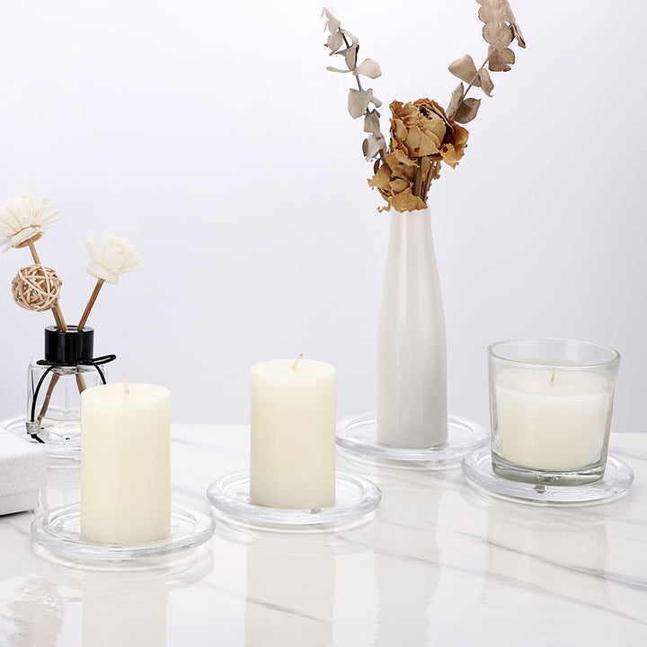 - Package includes 5 PCS Glass Pillar Candle Plates. Overall dimension (Outer Dia x Inner Dia x Total Height) is 10cm x 7.8cm x 0.9cm / 3.9 x 3 x 0.35, suitable for placing pillar candle, wick candle, led candle, thick candle, tealight candle, votive candle and various candles.