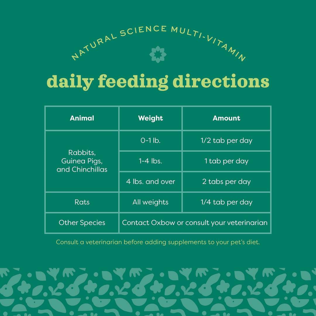 | directions | When changing your pet’s daily regimen, consult your veterinarian. Rabbits, Guinea Pigs, and Chinchillas: 0-1 lb: 1/2 tab per day 1-4 lb: 1 tab per day 4 lb & over: 2 tabs per day Rats (all weights): 1/4 tab per day Other Species: Contact Oxbow or consult your veterinarian |