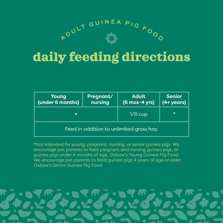 | directions | Feed 1/8 cup daily in addition to unlimited grass hay to guinea pigs over the age of 6 months. *This product is not intended for growing, active, pregnant or nursing guinea pigs. We encourage pet owners to feed Oxbow Essentials Young Guinea Pig Food during these stages of life. Please note that these are guidelines. If your guinea pig is overweight or underweight, please contact your veterinarian or Oxbow for more specific feeding information. Seventy percent of your guinea pig's diet should be grass hay. Oxbow offers a variety of hand-selected, high-fiber hays to enrich the life and health of your pet. Transitioning to a New Food: Week 1, mix 3 parts current food with 1 part new food. Week 2, mix 2 parts current food with 2 parts new food. Week 3, mix 1 part current food with 3 parts new food. Week four, feed Organic Bounty - Adult Guinea Pig exclusively. |