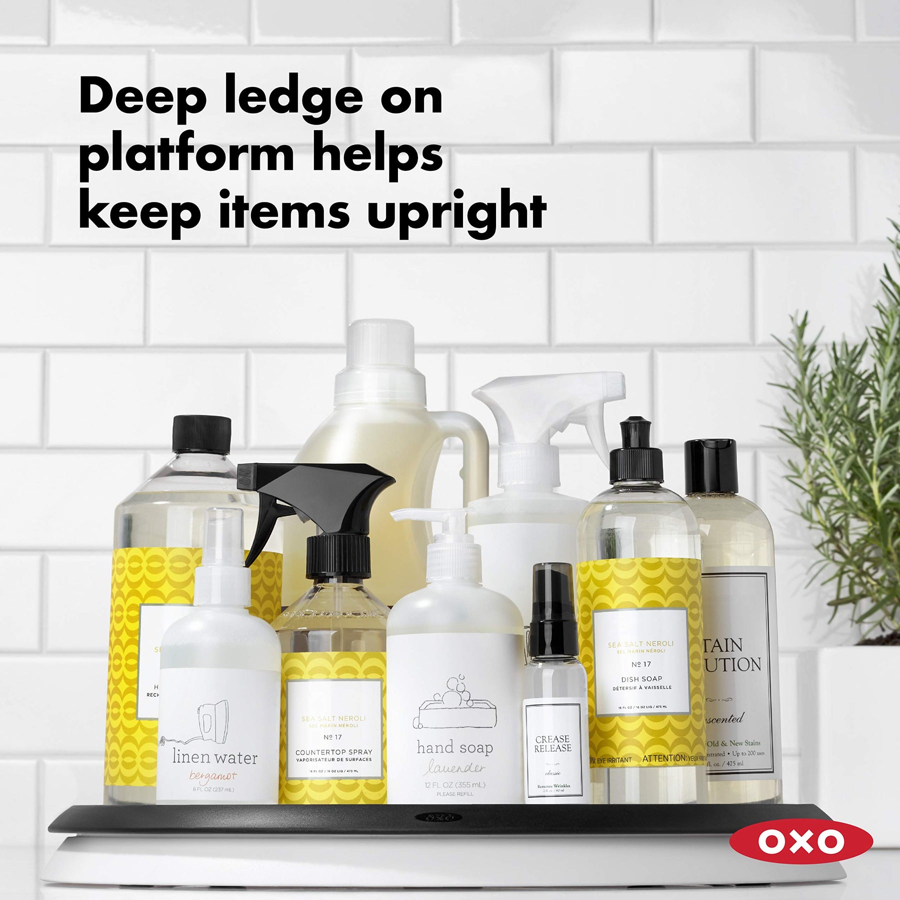- Deep ledge on platform helps keep items upright