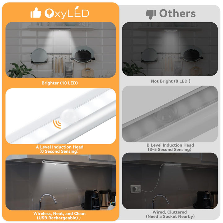 - Original Under-Cabinet Lights – Under Cabinet Lighting, USB Rechargeable Motion Sensor Closet Light, Wireless Magnetic Stick-on Cordless 10 LED Night Light Bar for Closet Cabinet Wardrobe Stairs, 2 Pack by OxyLED