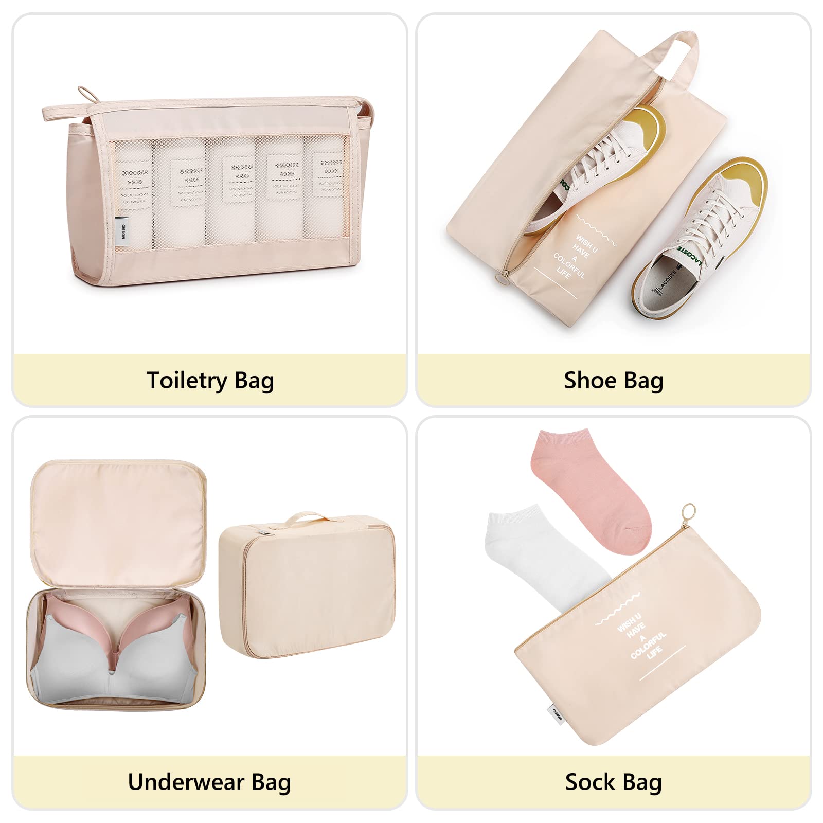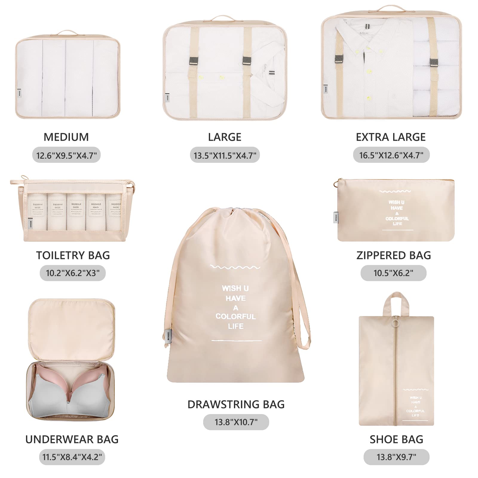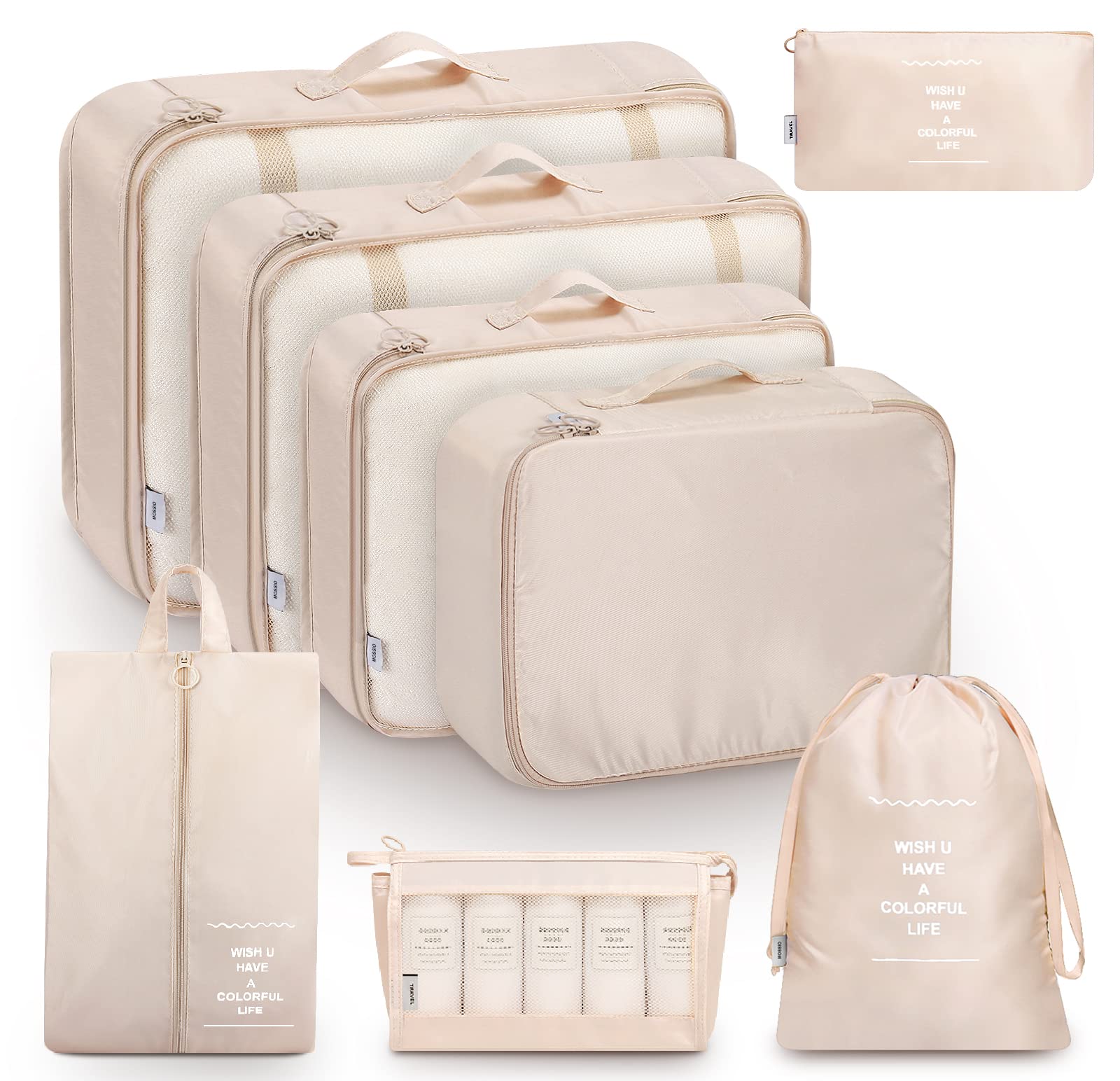 - THE PACKING CUBES FOR EVERYWHERE YOU GO - 3 X different size Packing Cubes, 1 X Bra Underwear Bag, 1 X Toiletry Bag, 1 X Drawstring Laundry Bag, 1 X Shoe Bag, 1 X Zippered Bag. A must-have travel accessory. Ideal for active lifestyles including traveling, backpacking, camping, gym or beach