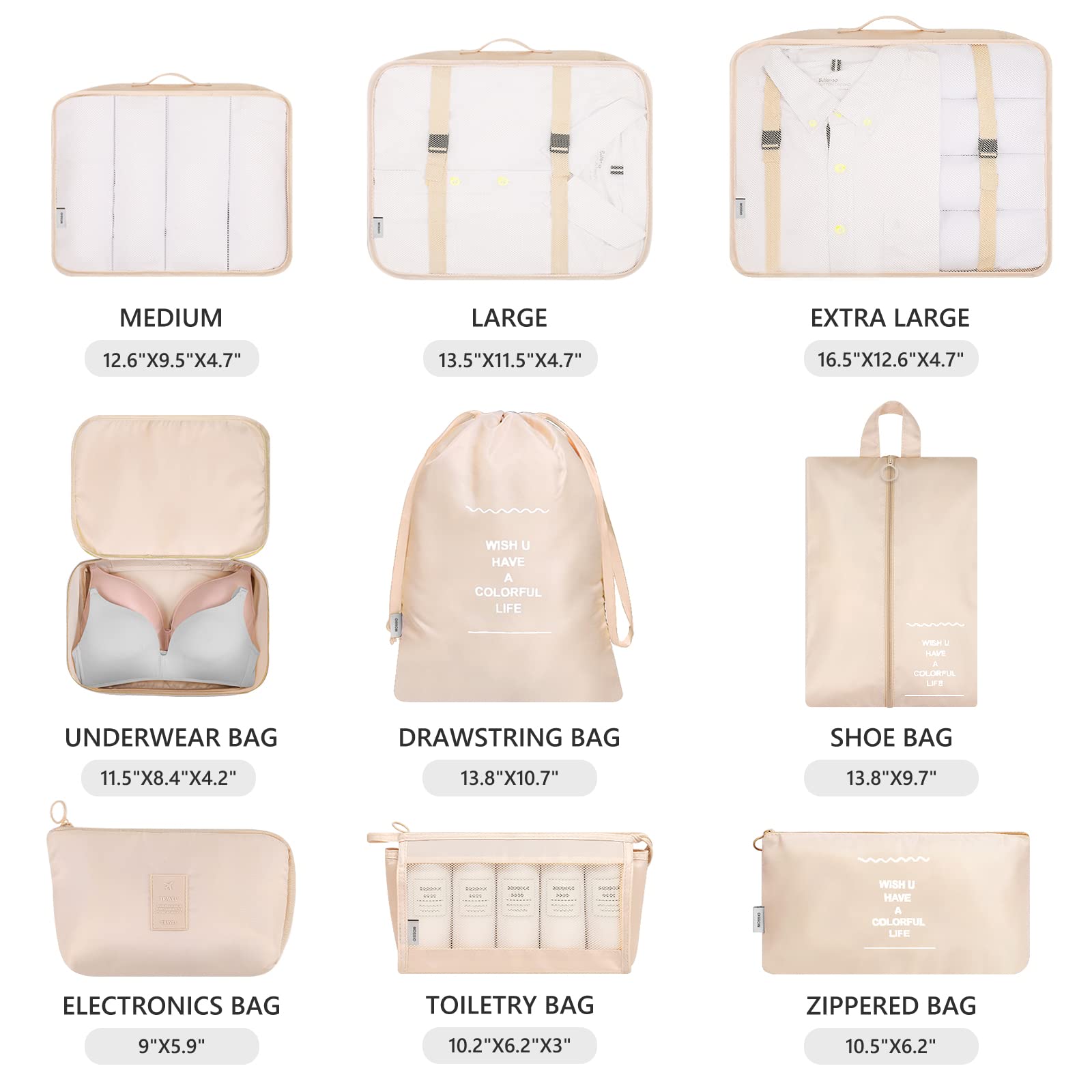 - THE PACKING CUBES FOR EVERYWHERE YOU GO - 3 X different size Packing Cubes, 1 X Bra Underwear Bag, 1 X Toiletry Bag, 1 X Drawstring Laundry Bag, 1 X Shoe Bag, 1 X Zippered Bag, 1 X Electronics Bag. A must-have travel accessory. Ideal for active lifestyles including traveling, backpacking, camping, gym or beach