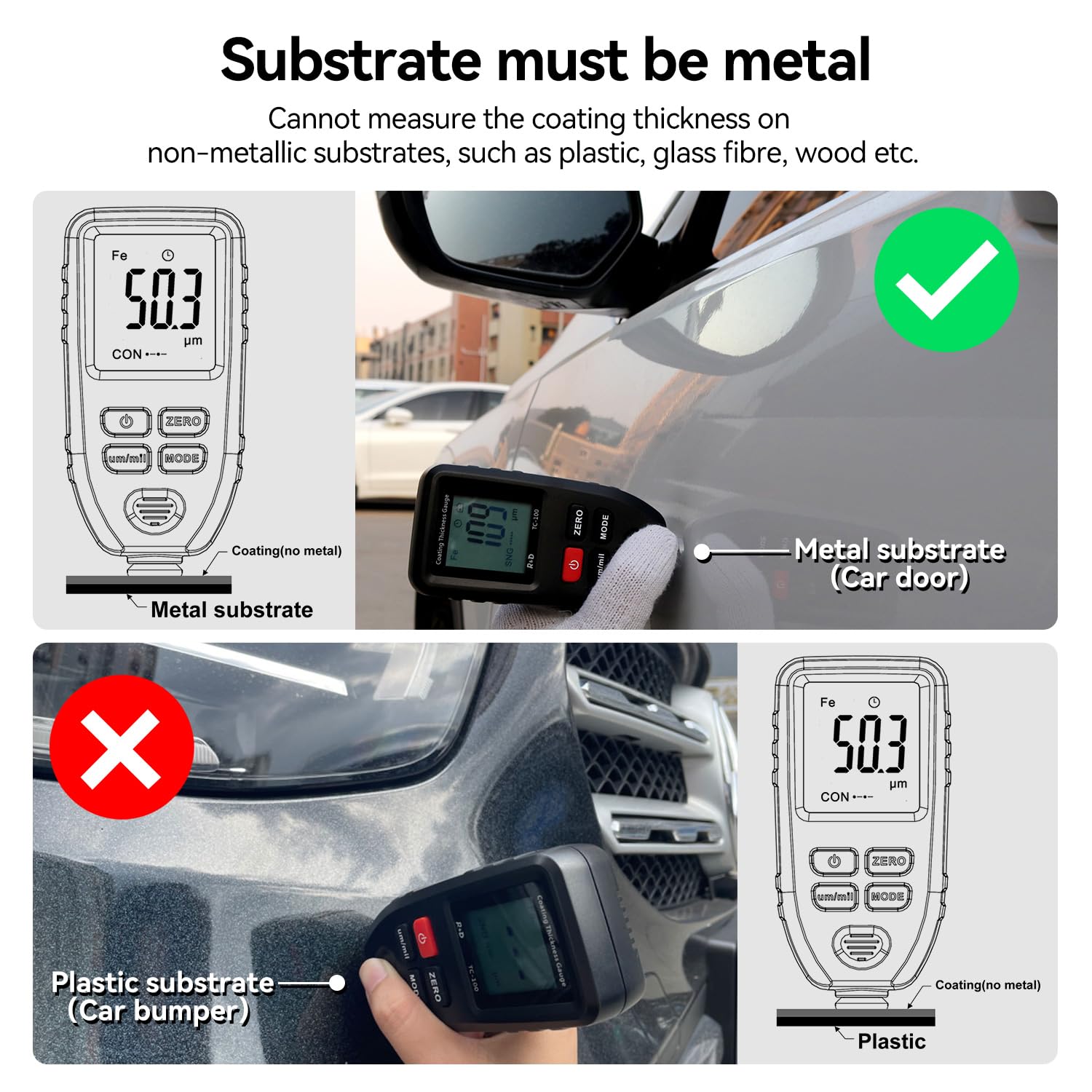 - Please Note: This Coating thickness instrument cannot measure the painting on non-metallic surfaces such as plastics. Please make sure you are working on metal substrate, like Steel Aluminum or the other metal substrate