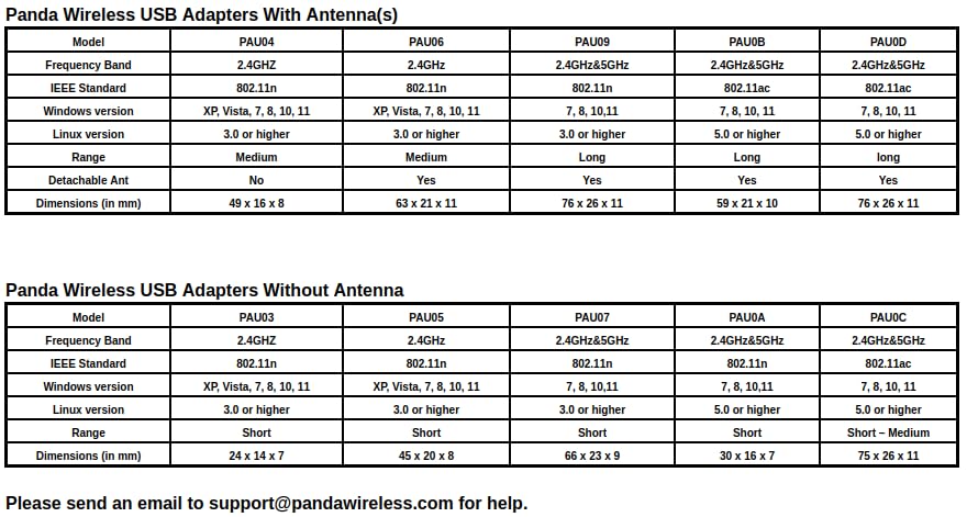 - Multi-OS support: 32-bit and 64-bit Windows 7/8/10/11, Zroin, MX LInux, Manjaro, Linux Mint, Ubuntu, Lubuntu, OpenSUSE, RedHat, Fedora, CentOS, Kali Linux, Raspbian. NO Mac support for Panda Wireless PAU09.