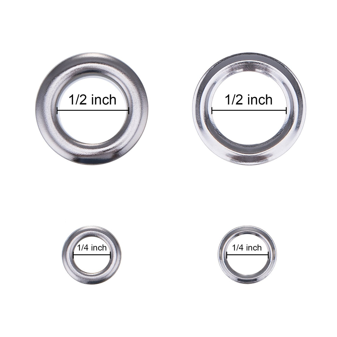 - 200 Sets of grommets eyelets: includes 100 sets of 1/ 2 inch inside diameter and 100 sets of 1/ 4 inch inside diameter, each set includes 1 eyelet and 1 washer