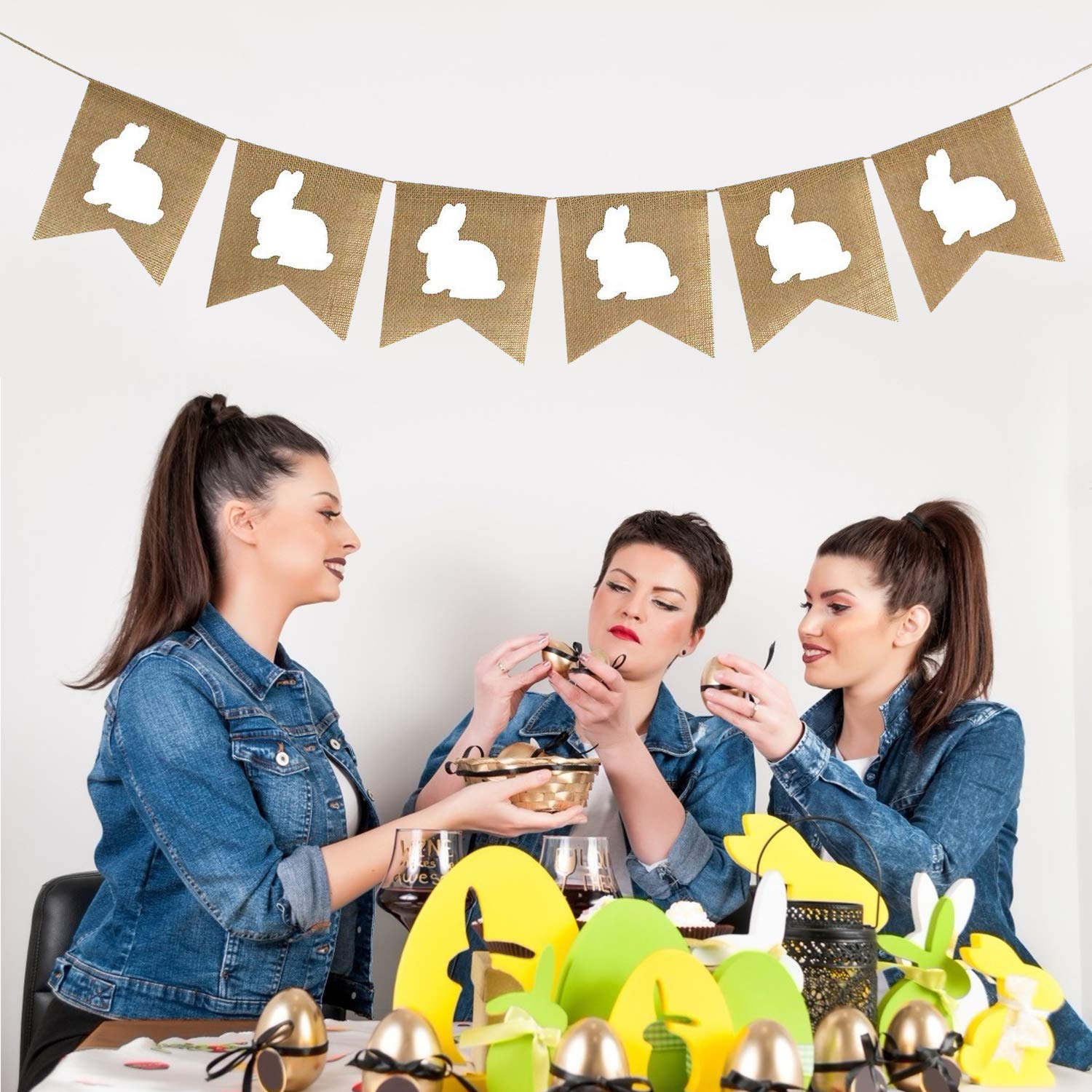 Six white rabbit signs on brown burlap flags, full of Easter day atmosphere, perfect accent for your decorations.