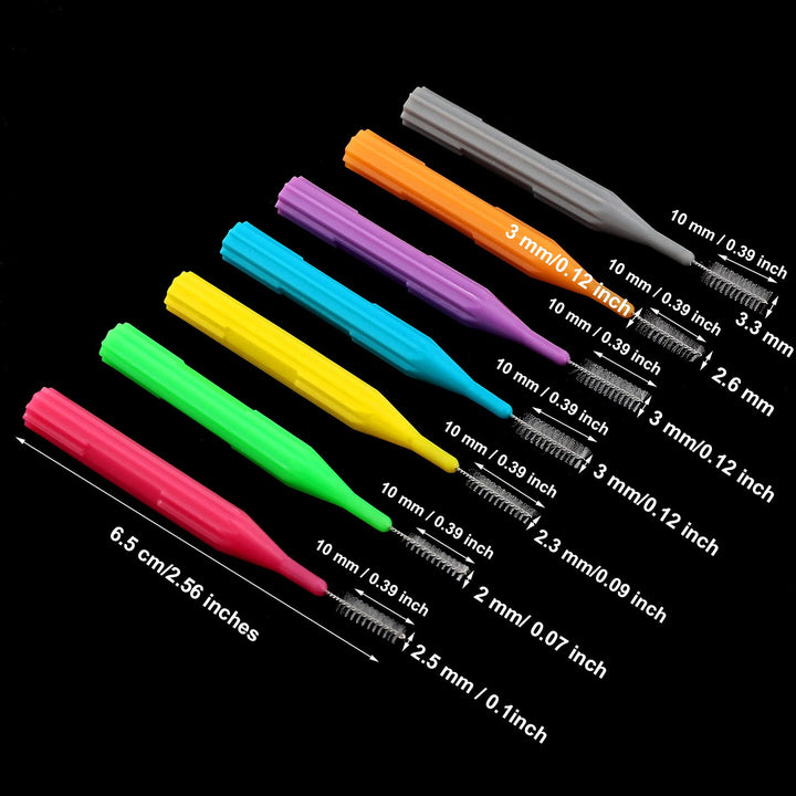 - Various sizes: the blue head diameter is 3 mm/ 0.12 inch, the purple head diameter is 3 mm/ 0.12 inch, the yellow head diameter is 2.3 mm/ 0.09 inch, the grey head diameter is 3.3 mm/ 0.13 inch, dental brush length is approx. 6.5 cm/ 2.56 inches, brush hair length is approx. 1 cm/ 0.39 inch, 4 sizes of interdental heads to suit different sizes of teeth
