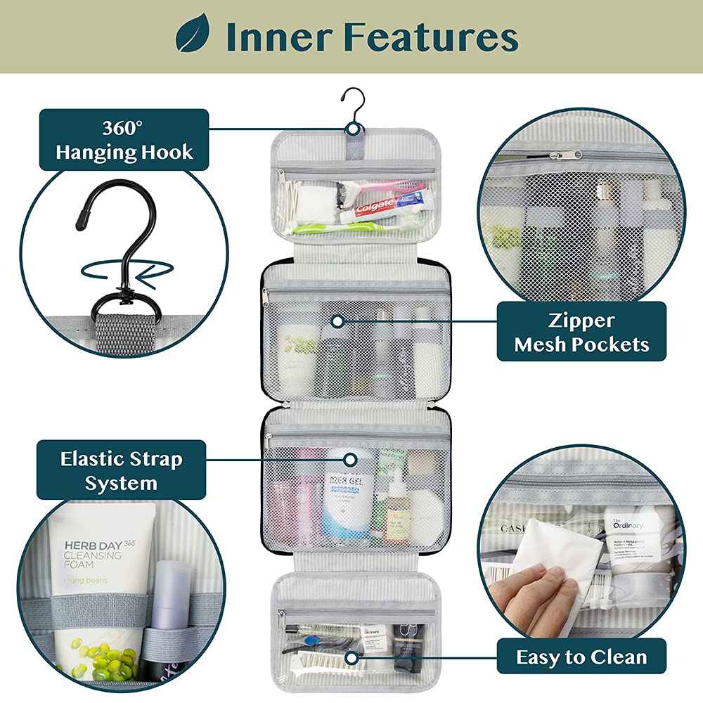 - HANGING COSMETICS TRAVEL BAG ORGANIZER: This toiletry bag for women has a hanging hook and multiple pockets that help you stay organizer during business trip, vacation travel. The hanging hook makes it easy to hang the toiletry bag to bars in the hotel shower bathroom. Unzip your toiletry bag to reveal compartments to organize your shampoo, skincare face hygiene products. This toiletry travel bag is an essential accessory for cruise in Europe, plane, Hawaii Trip, and honeymoon.