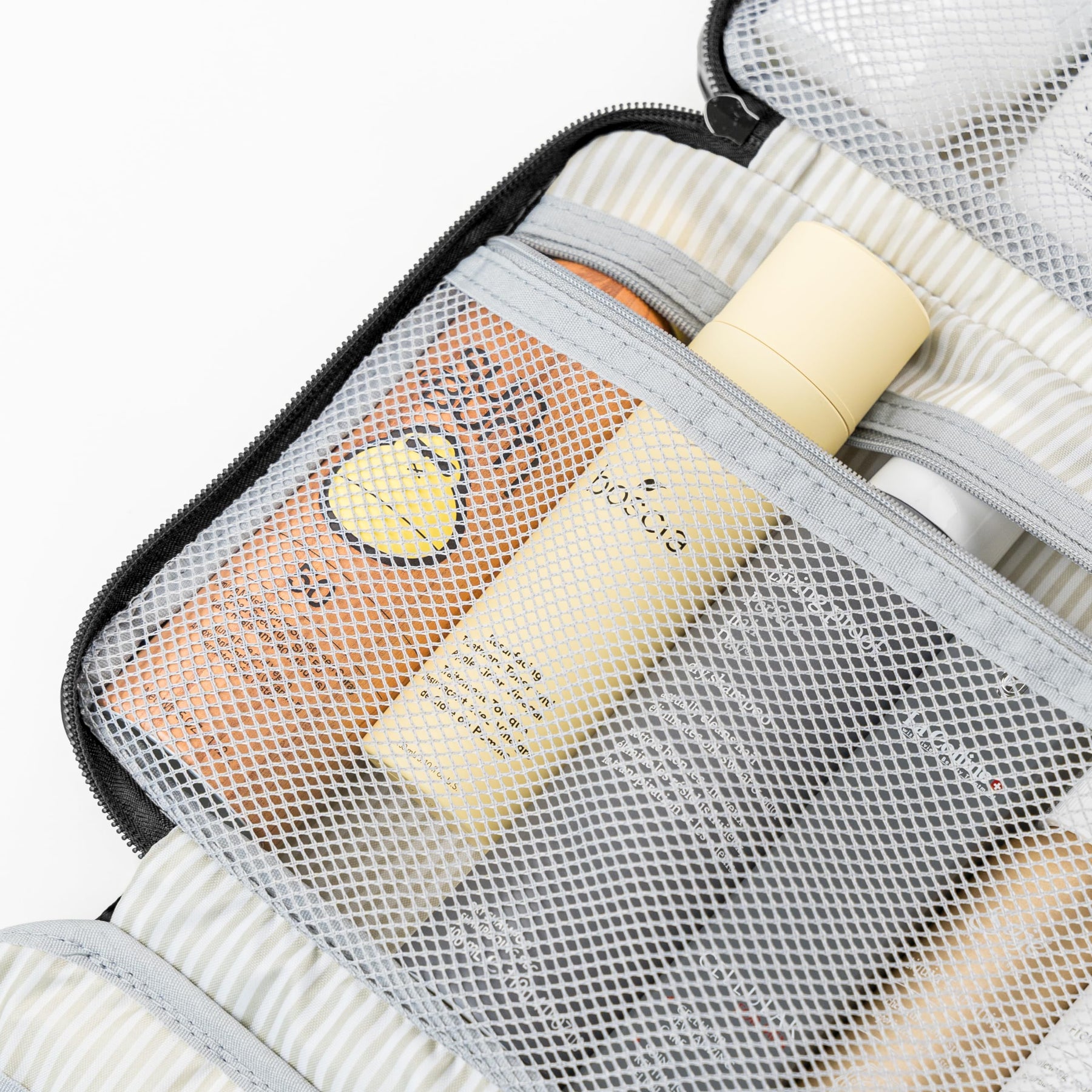 - QUALITY CONSTRUCTION Striped interiors for a modern look, elastic bands for holding toothbrush/make-up brush, durable metal zippers we have meticulously designed this TSA approved toiletry bag so you can travel in peace and style, or simply to keep your toiletry organized at home.