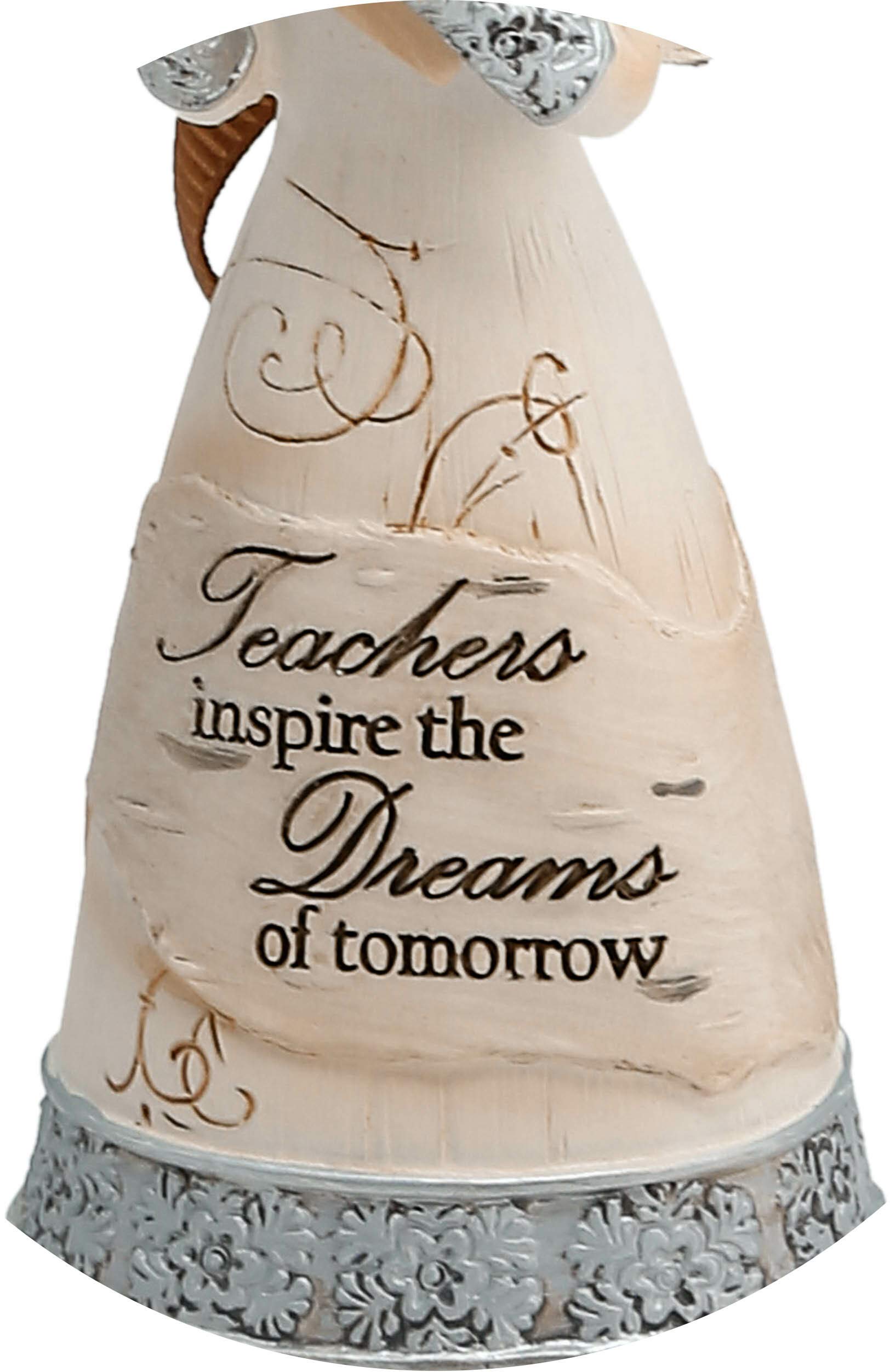 - IN-HOUSE DESIGN: Teachers Inspire The Dreams Of Tomorrow text is debossed and painted onto the front of the angel, alongside an intricate silver design, book, and apple.