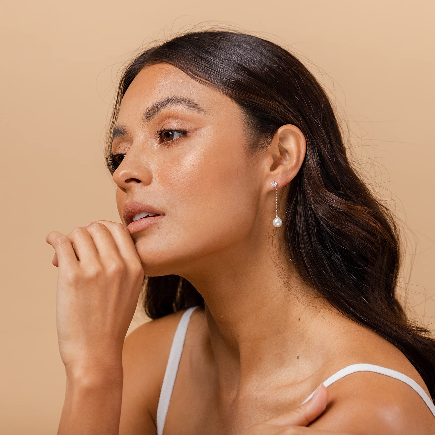 - Reimagine the classic pearl stud with a funky twist! These pearl drop earrings showcase a brilliant 4mm CZ stone, elegantly linked by a 0.8-inch chain to an 8mm shell pearl. The quintessential statement for those seeking a unique take on the beloved Pearl Dangle Earring!