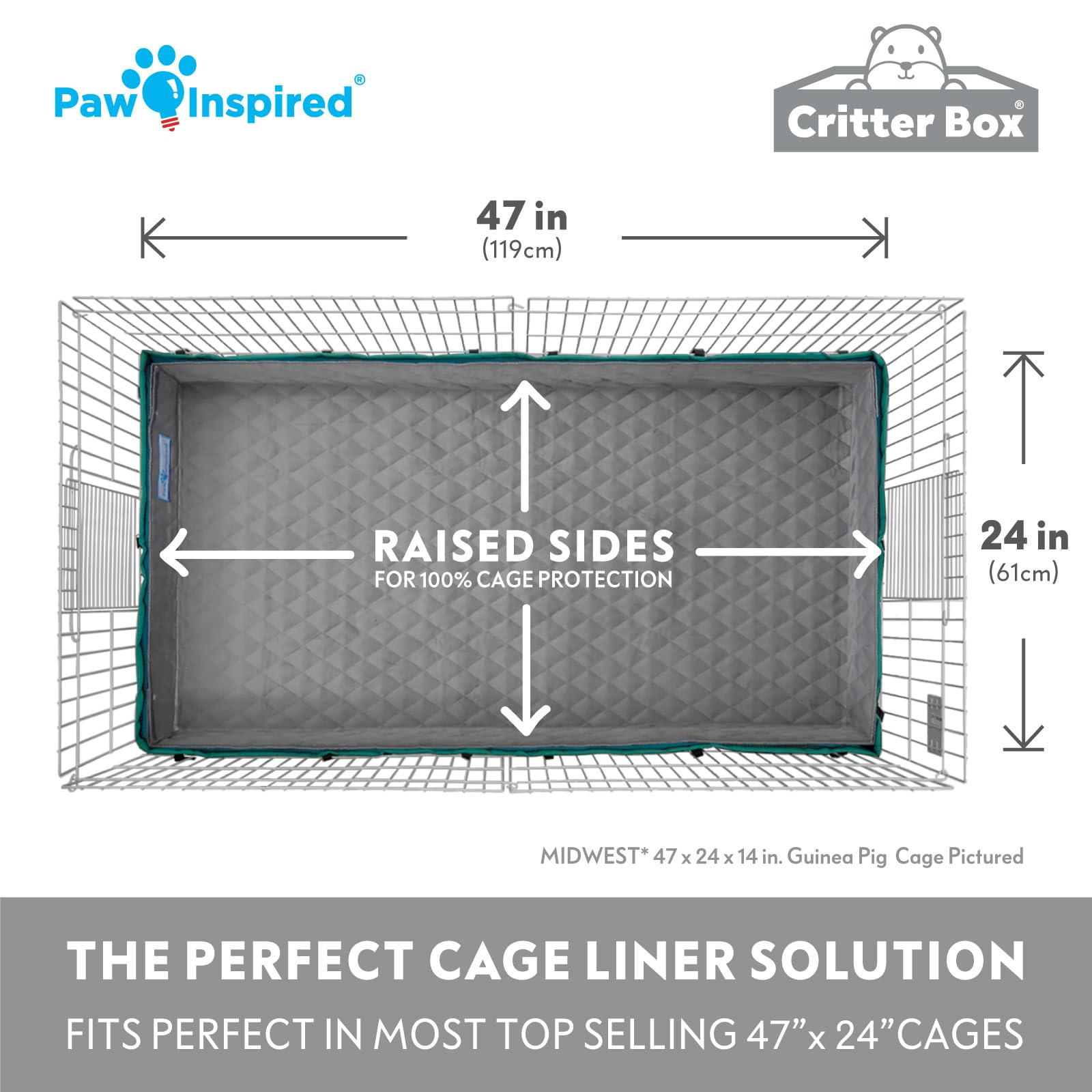 - SIMPLY THE BEST CAGE LINER HABITAT: No more scrubbing dirty cage corners and bottoms. With the raised and walled sides of the Critter Box your cage will stay 100% clean and protected. The barriered absorbent side assure all messes stay contained on the washable cage liner itself. When you are ready to change the liner, simply pick it up, shake it out in the trash can, and throw it in the wash.