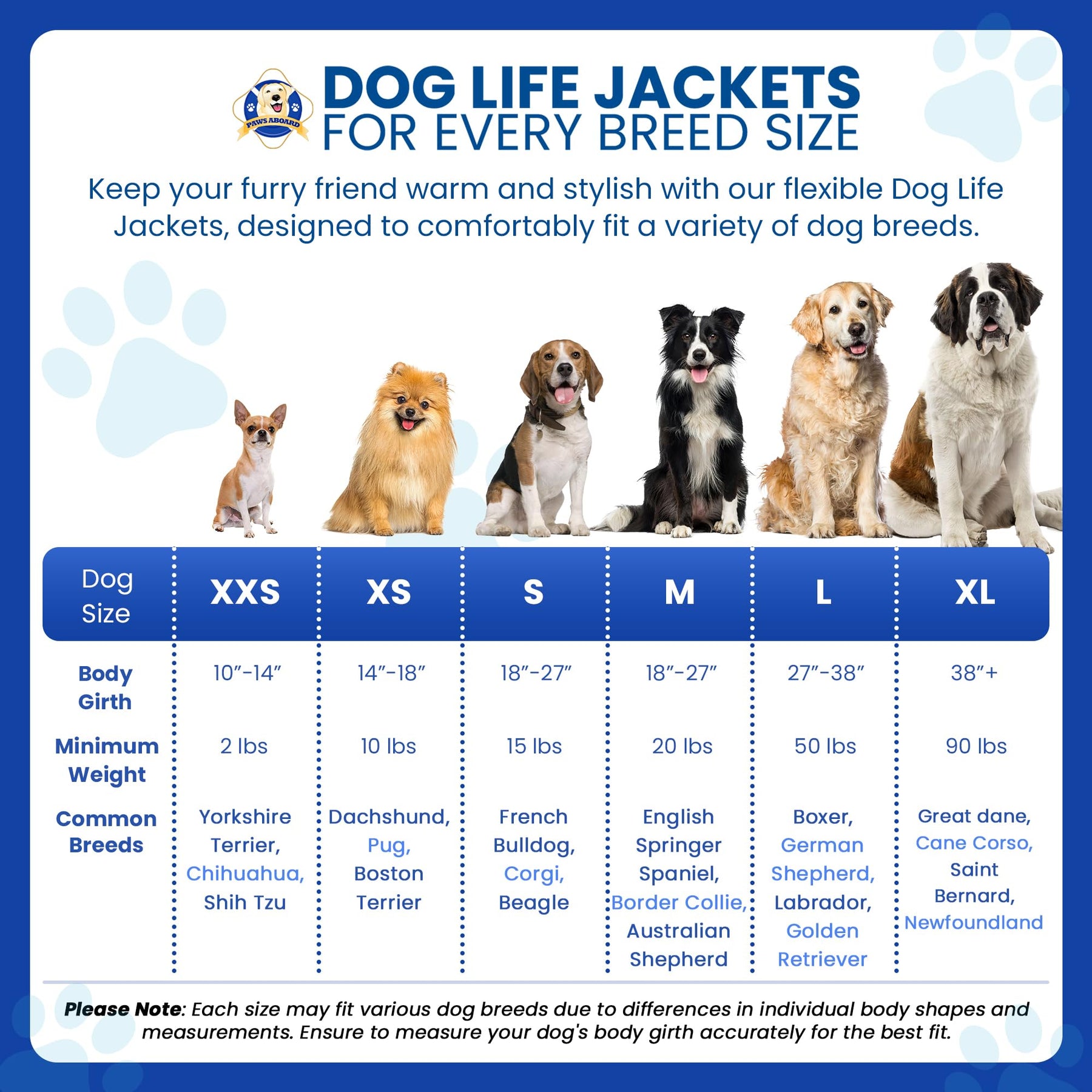 - MULTIPLE SIZES - Paws Aboard Dog Life Jackets are available in XX-small, X-small, Small, Medium, Large and X-large sizes. Dogs come in all shapes and sizes, so should their safety!
