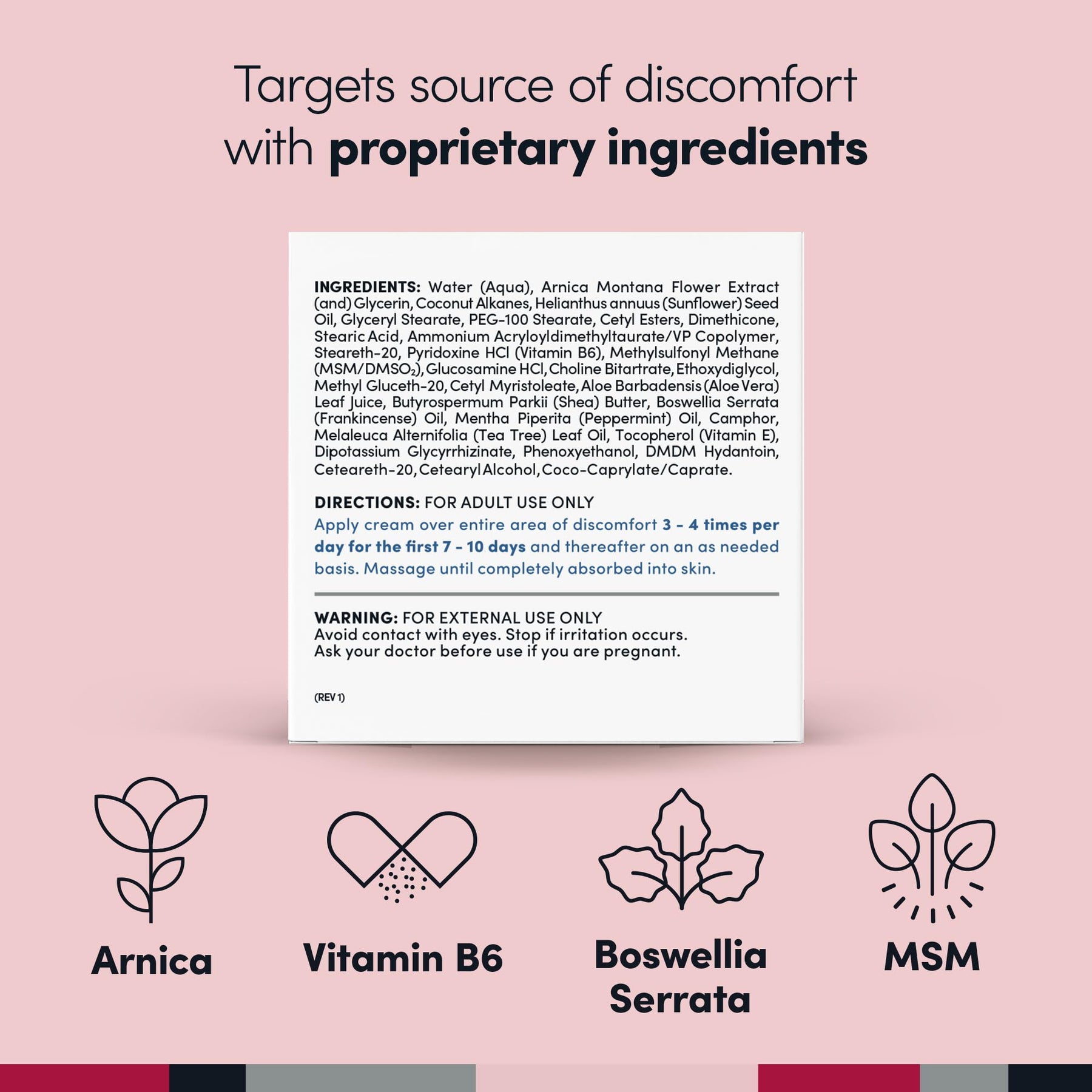 | ingredients | Water (Aqua), Arnica Montana Flower Extract, Helianthus Annuus (Sunflower) Seed Oil, Glycerin, Glyceryl Stearate, PEG-100 Stearate, Cetyl Esters, Steareth-20, Pyridoxine Hydrochloride (Vitamin B6), Methylsulfonylmethane (MSM/DMSO2), Glucosamine (Vegetable Source), Bilineurine Bitartrate, Ethoxydiglycol, Methyl Gluceth-20, Cetyl Myristoleate, Aloe Barbadensis (Aloe Vera) Leaf Extract, Butyrospermum Parkii (Shea Butter), Boswellia Serrata (Frankincense) Oil, Mentha Piperita (Peppermint) Oil, Cinnamomum Camphora (Camphor), Melaleuca Alternifolia (Tea Tree) Leaf Oil, Tocopherol (Vitamin E), Dipotassium Glycyrrhizinate, Dimethicone, Ammonium Acryloyl-Dimethyltaurate/VP Copolymer, Phenoxyethanol, DMDM Hydantoin, Iodopropynyl Butylcarbamate |
