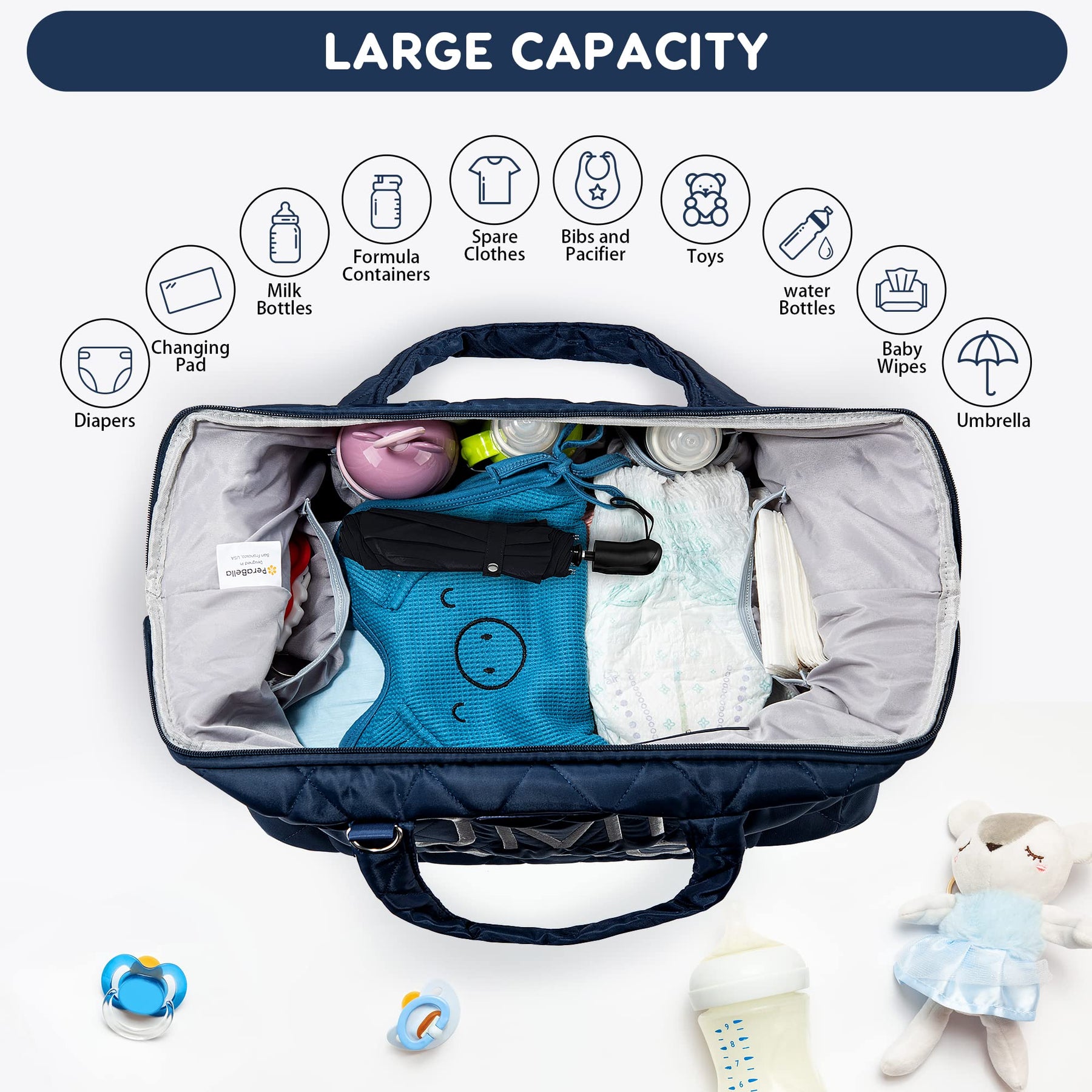 - IDEAL BABY TRAVEL BAG: PeraBella's lightweight, quilted mom bag for hospital offers hands-free ease. Large interior fits everything from diapers to hospital essentials and the extra wide opening makes it easy to find pregnancy essentials quickly.