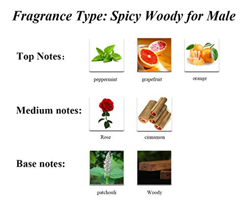 - Fragrance type: Woody for Male; Top notes: Grapefruit, peppermint and orange; Medium notes: Rose, cinnamon, spices; Base notes: Woody, patchouli, amber.