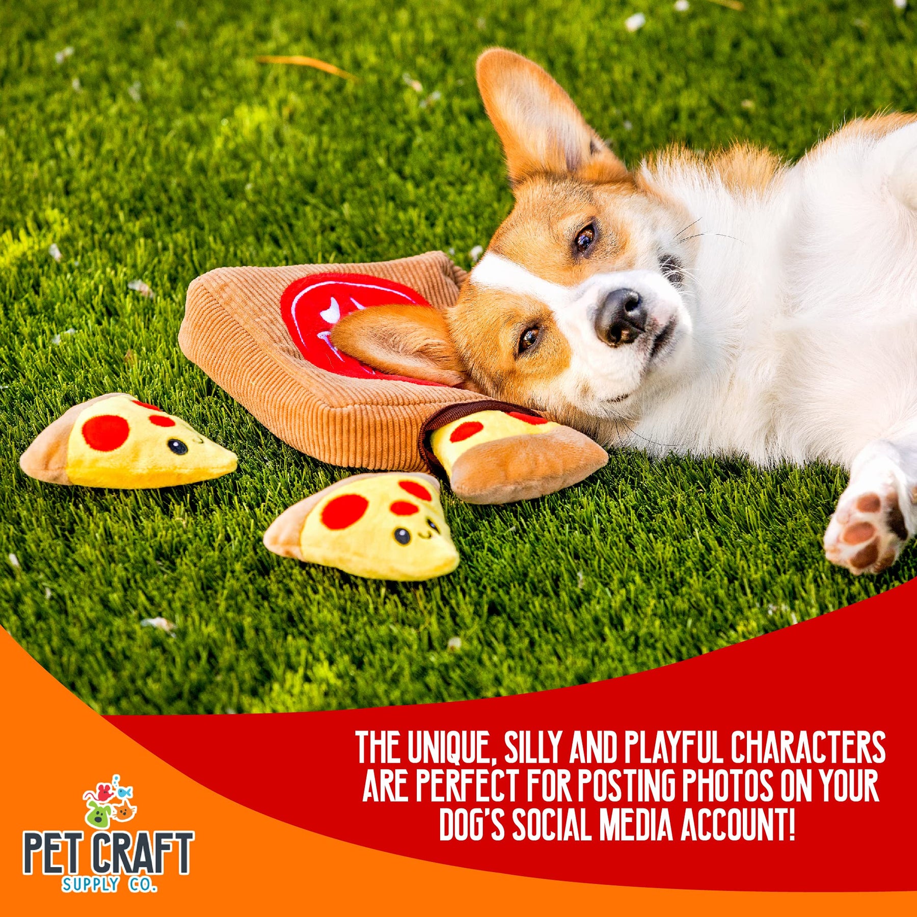 - SQUEAKY, CRINKLY, INTERACTIVE FUN: Keep your dog entertained all day long with the Pet Craft Supply Hide and Seek Plush Dog Toys! Easily fill the pizza box with 3 stuffed squeaky and crinkle smaller toys and let your put burrow into it for loads of fun!