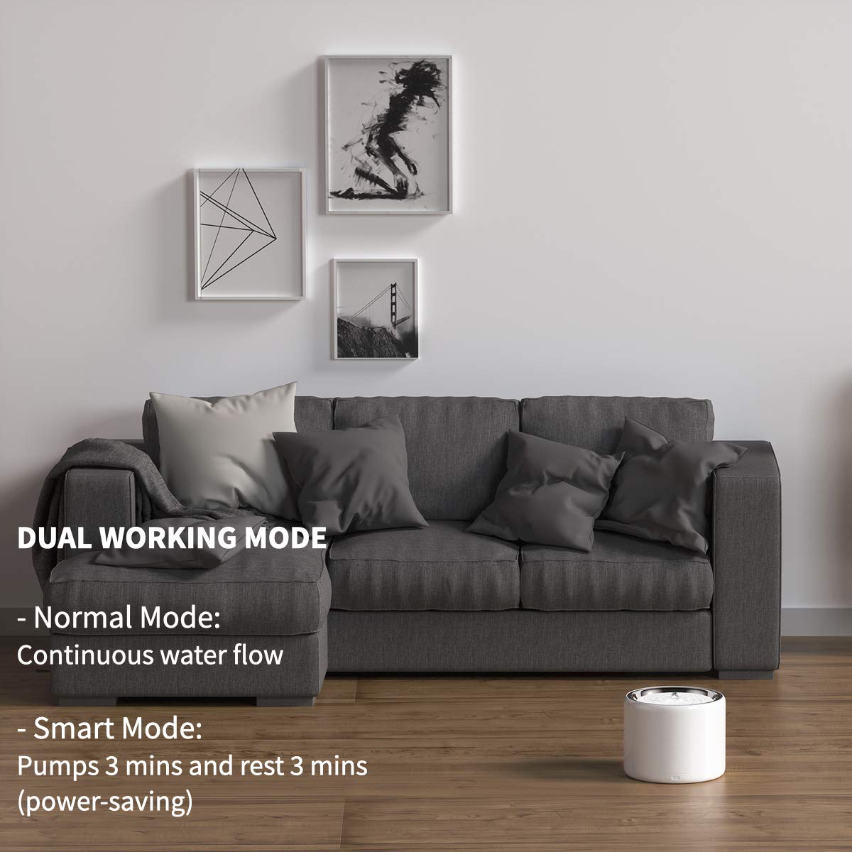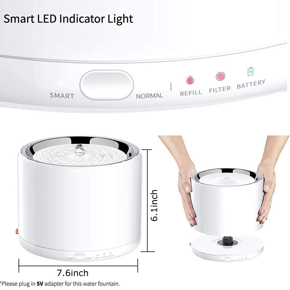 - DUAL WORKING MODE--- Embedded LED lights can remind you of the work status. One-button operation to choose Normal Mode for freshwater 24/7 and a Smart Mode to save energy. The pump will automatically shut off when the water storage level is too low.