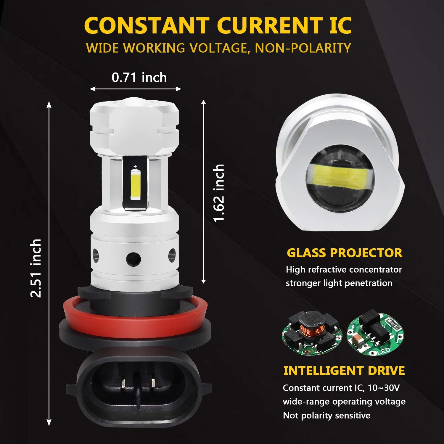 - (Pack of 2) Brightness: 1900LM per H11 H8 LED fog light bulb, 3800LM per set; Current: 720Ma; Power: 8.6W; Voltage: 12V~24V; Waterproof IP67; Color: 6000K Xenon White