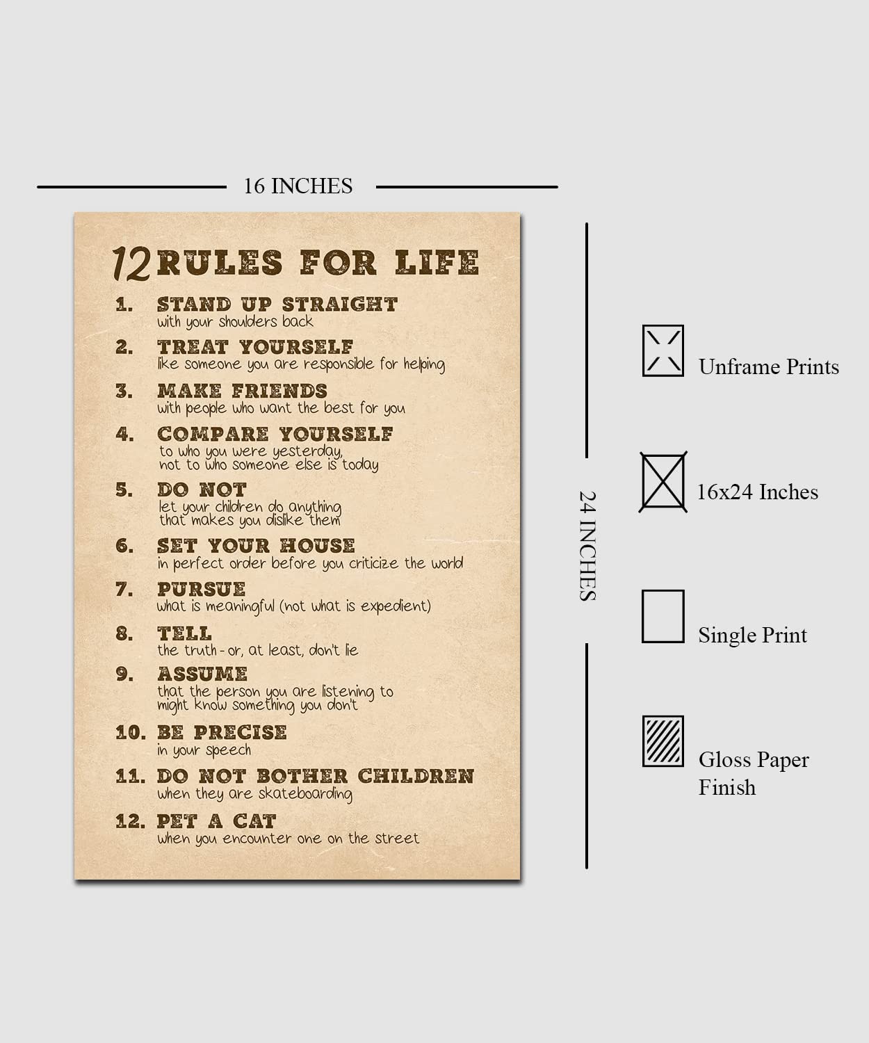 - 12 Rules for Life Motivational Poster - Jordan Peterson Inspirational Wall Art for Bedroom, Office, Home, Gym Decor - 16x24 Inch Unframed