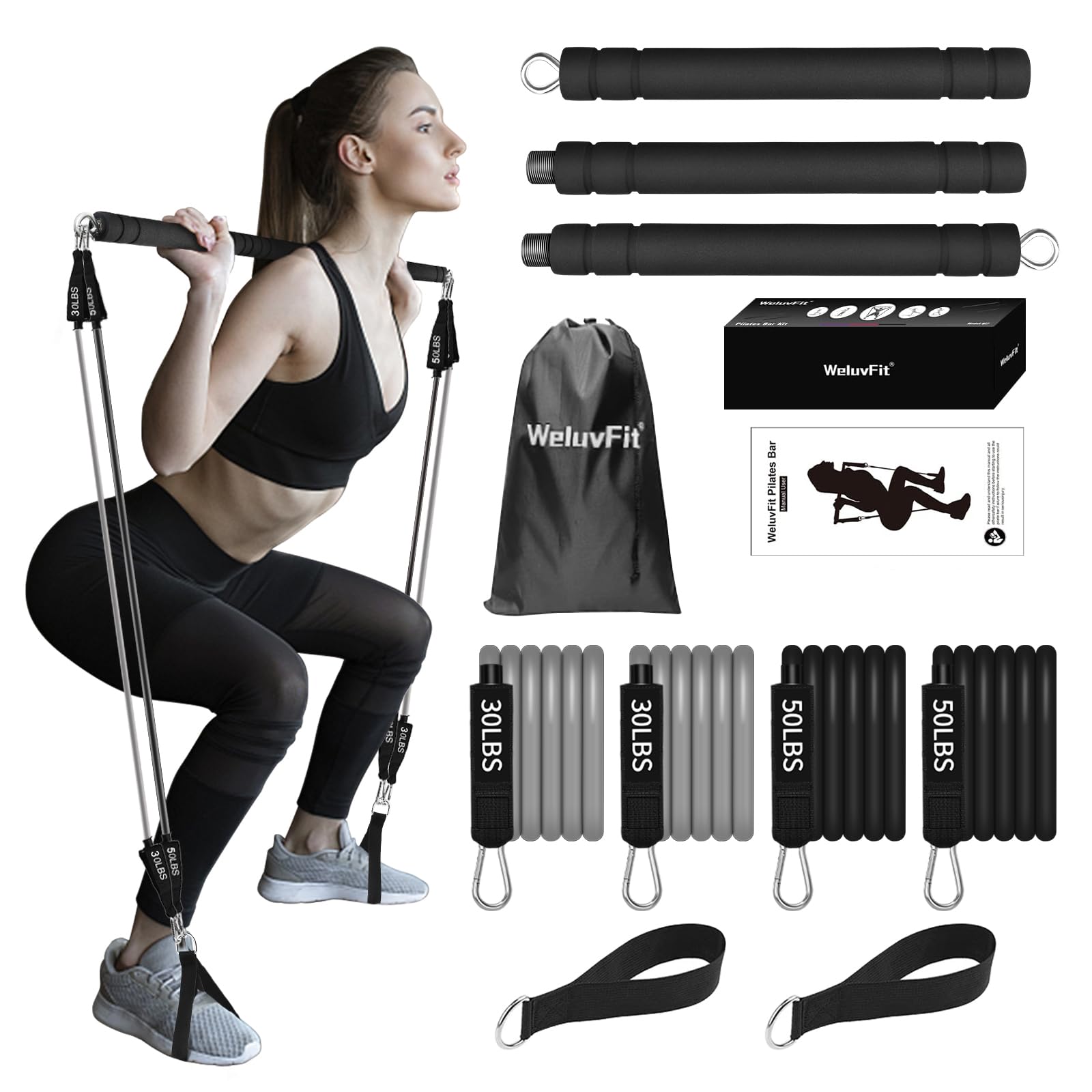 - Resistance Training HelperThe net lenght of resistance bands is 45cm(17.72inch), and it can be stretched to a length of 200cm (78.74inch) and is a great assistant to your resistance training. WeluvFit Pilates Bar Kit comes with 4 Resistance bands, varying in resistance 30+50=80 pounds. Pilates bars are ideal home fitness equipment for men and women and the option burning calories faster.