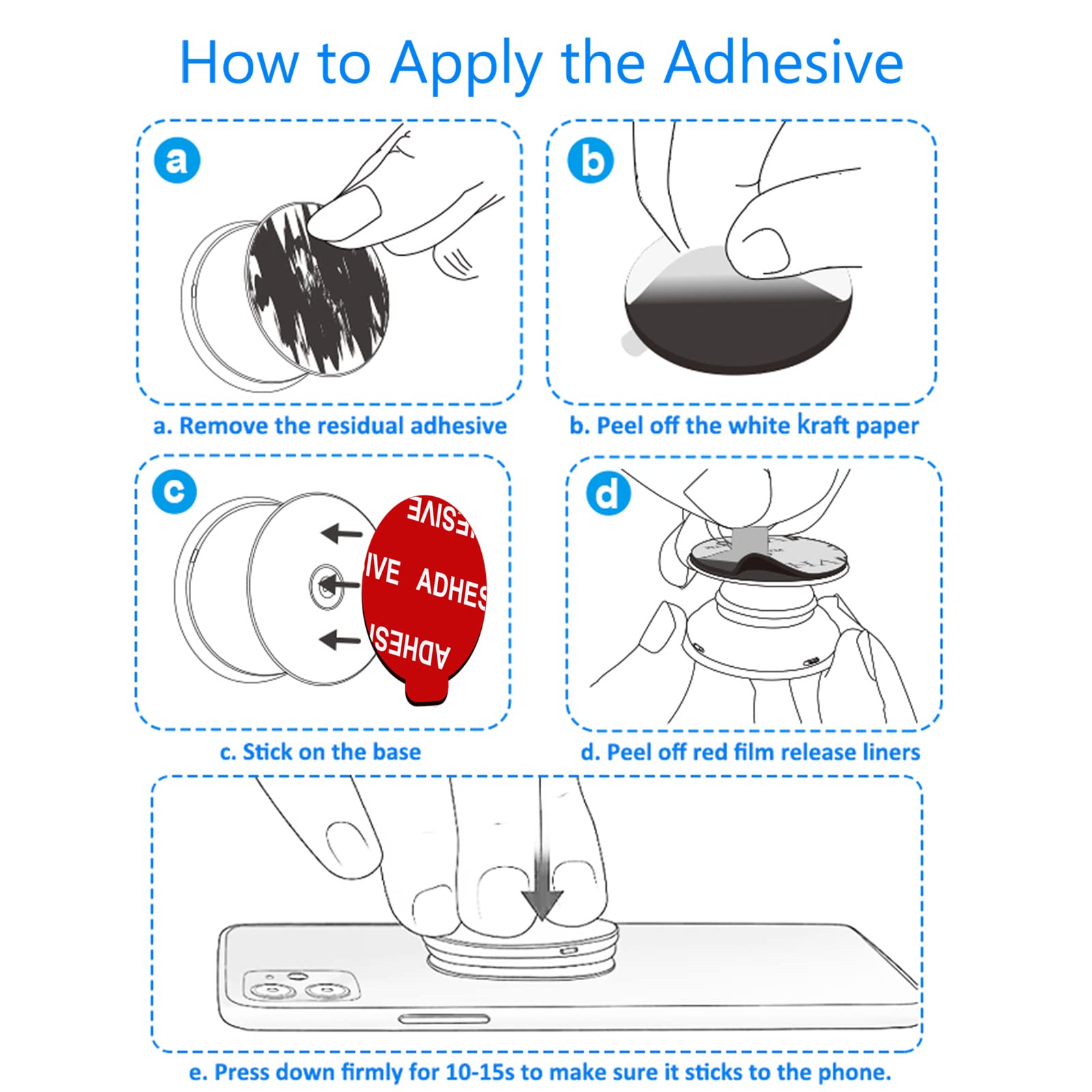 - Easy to UsePlease clean the adhesive surface before use and let it dry, free of contaminates. And wait at least 24 hours to use after stuck. First peel off the white side of the adhesive and stick it to the car mount base. After applying some pressure on the adhesive, peel off the red film side of the adhesive and stick the car mount to your car dashboard.