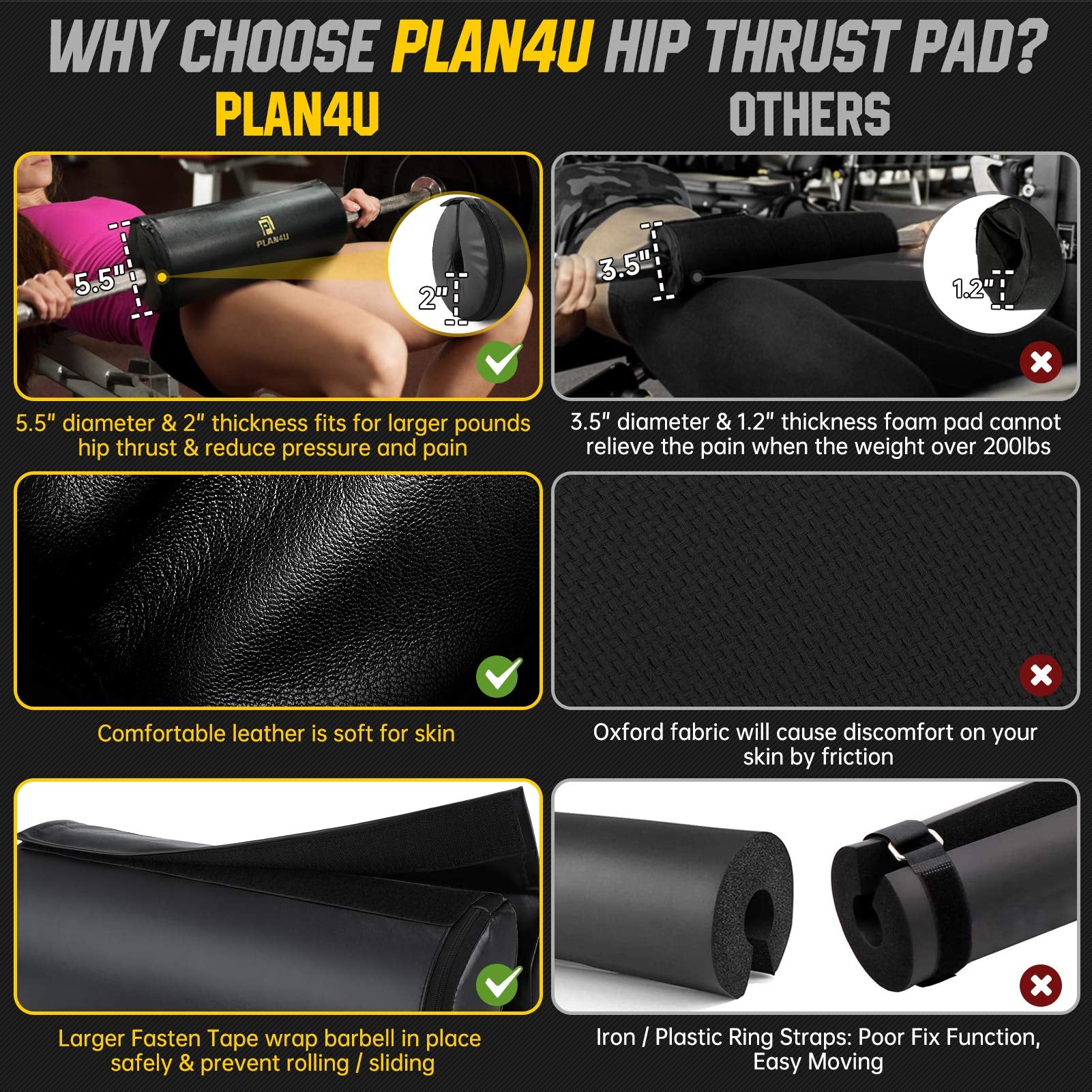 - UPGRADED 2 inches Ultra-thick Leather Foam Pad for Professional Bench Powerlifting: Plan4U bench Press Pad has a thickened foam pad and soft leather surface, which is suitable for diameters of 1-1.1” (25-28mm) Olympic barbell and 1-1.26” (25-32mm) Smith machine bar and ideal size for most barbells to train your chest muscles, triceps, hip muscles and hamstrings.Plan4U bench press foam pad greatly relieve pressure and pain points on your hips or pubis caused by heavy pounds.