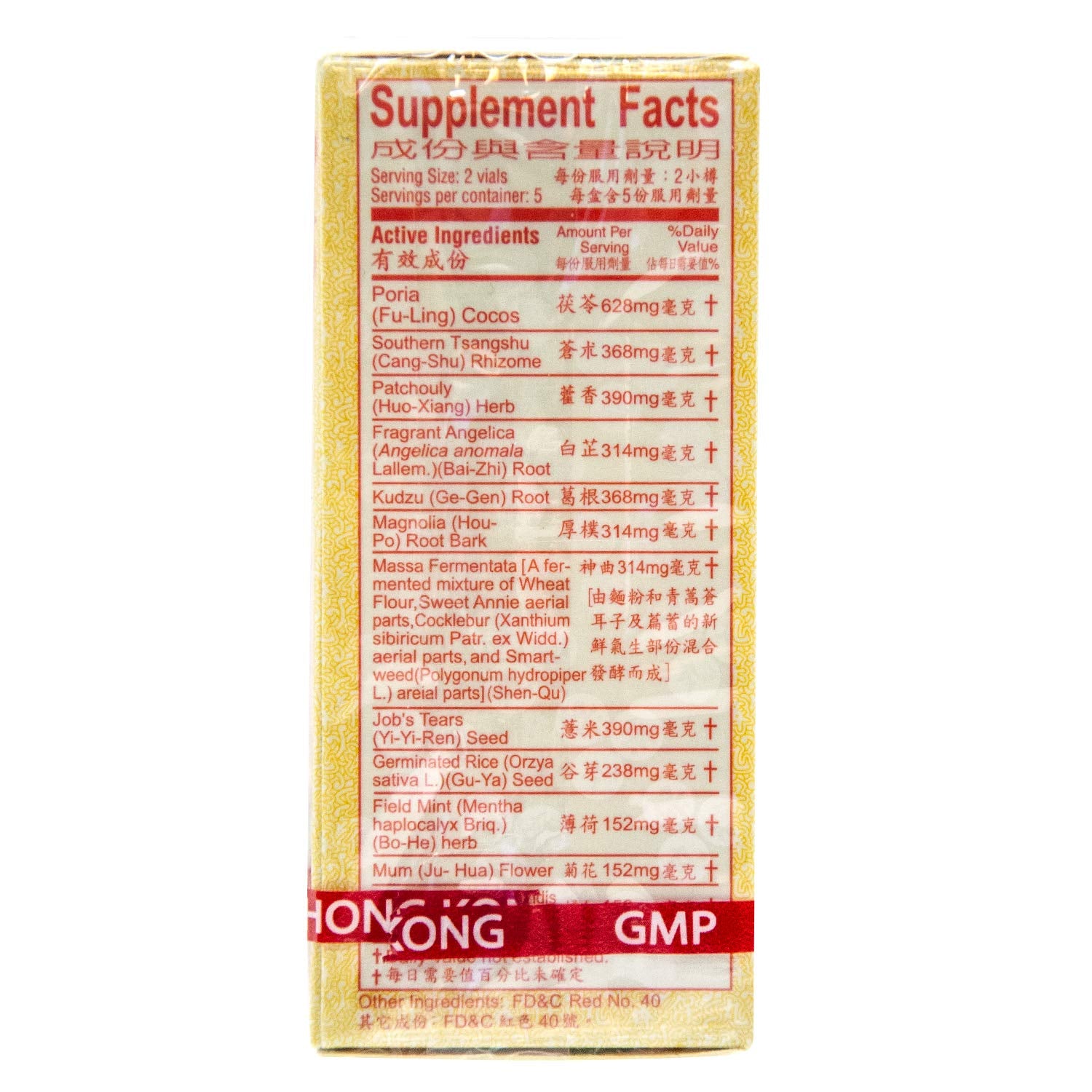 | special ingredients | Poria (Fu Ling), Southern Tsangshu Rhizome (Cang Shu), Patchouly Herb (Huo Xiang), Angelica Root (Bai Zhi), Kudzu Root (Ge Gen), Magnolia Root Bark (Hou Po), Massa Fermentata, Job's Tears Seed (Yi Yi Ren), Germinated Rice Seed (Gu Ya), Field Mint Herb (Bo He), Mu Flower (Ju Hua), Red Citrus Peel (Ju Hong) |