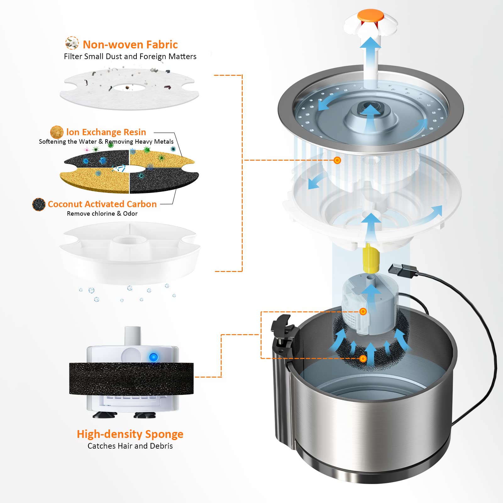 - EASY TO CLEAN AND MAINTAINThis stainless steel cat water dispenser is easy to clean and maintain. It features a simple design with only a few parts that need to be disassembled for cleaning, and it is dishwasher safe (excluding water pump,filter and the upper cover). This makes it easy for you to keep your pet's water supply clean and fresh at all times