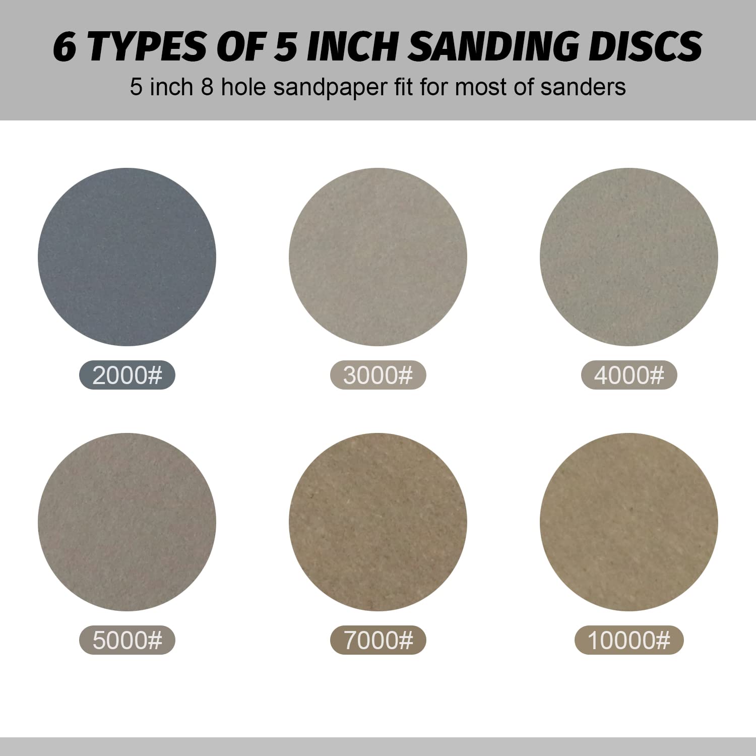 - 6 Types Of 5 Inch Sanding Discs: 5 pieces of each kind 2000/3000/4000/5000/7000/10000 and 1 pack 5 inch 8 holes interface pads,can meet almost all of your general polishing requirements