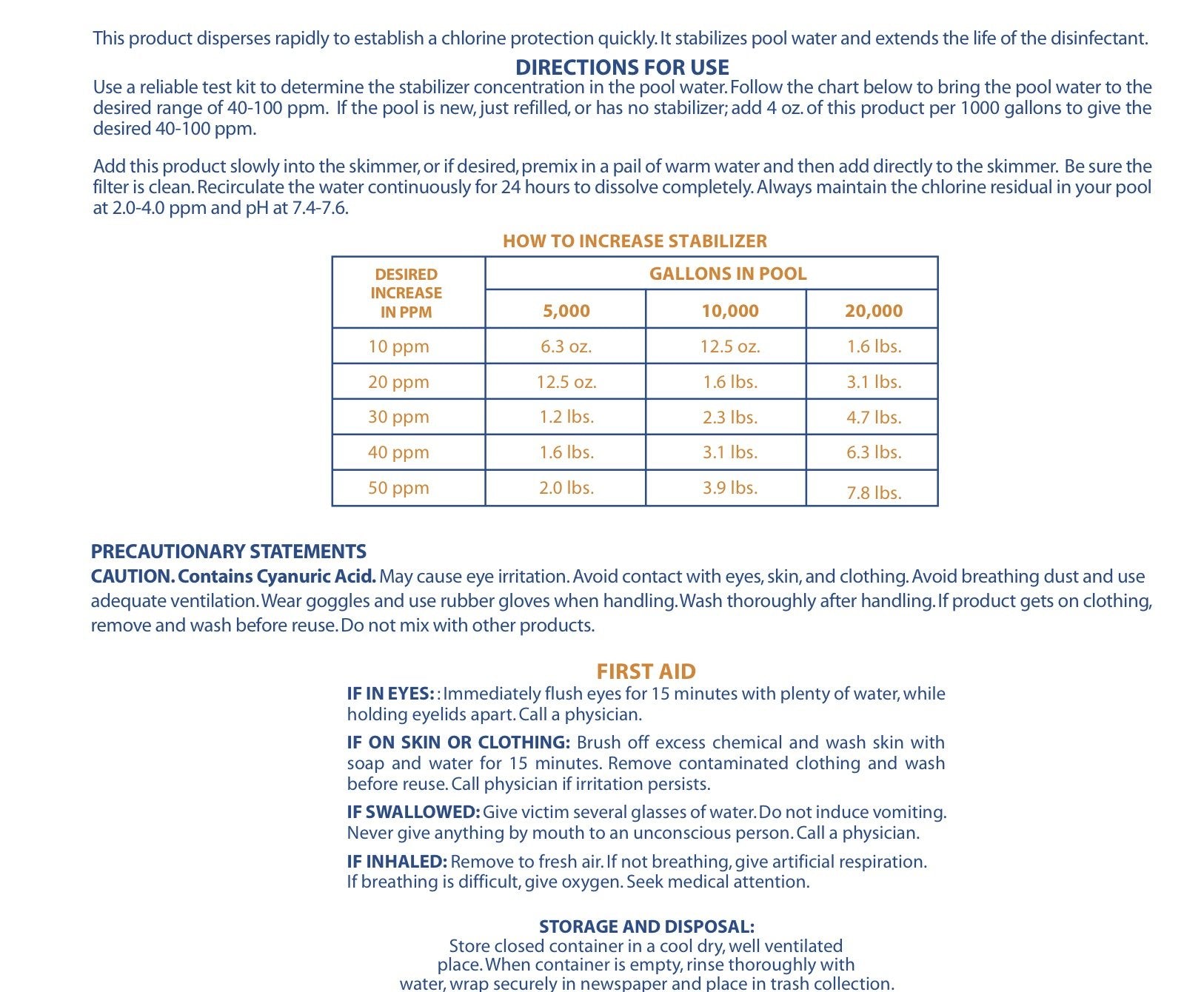 - 6 ounces raises cyanuric acid level 10 ppm per 5,000 gallons of water