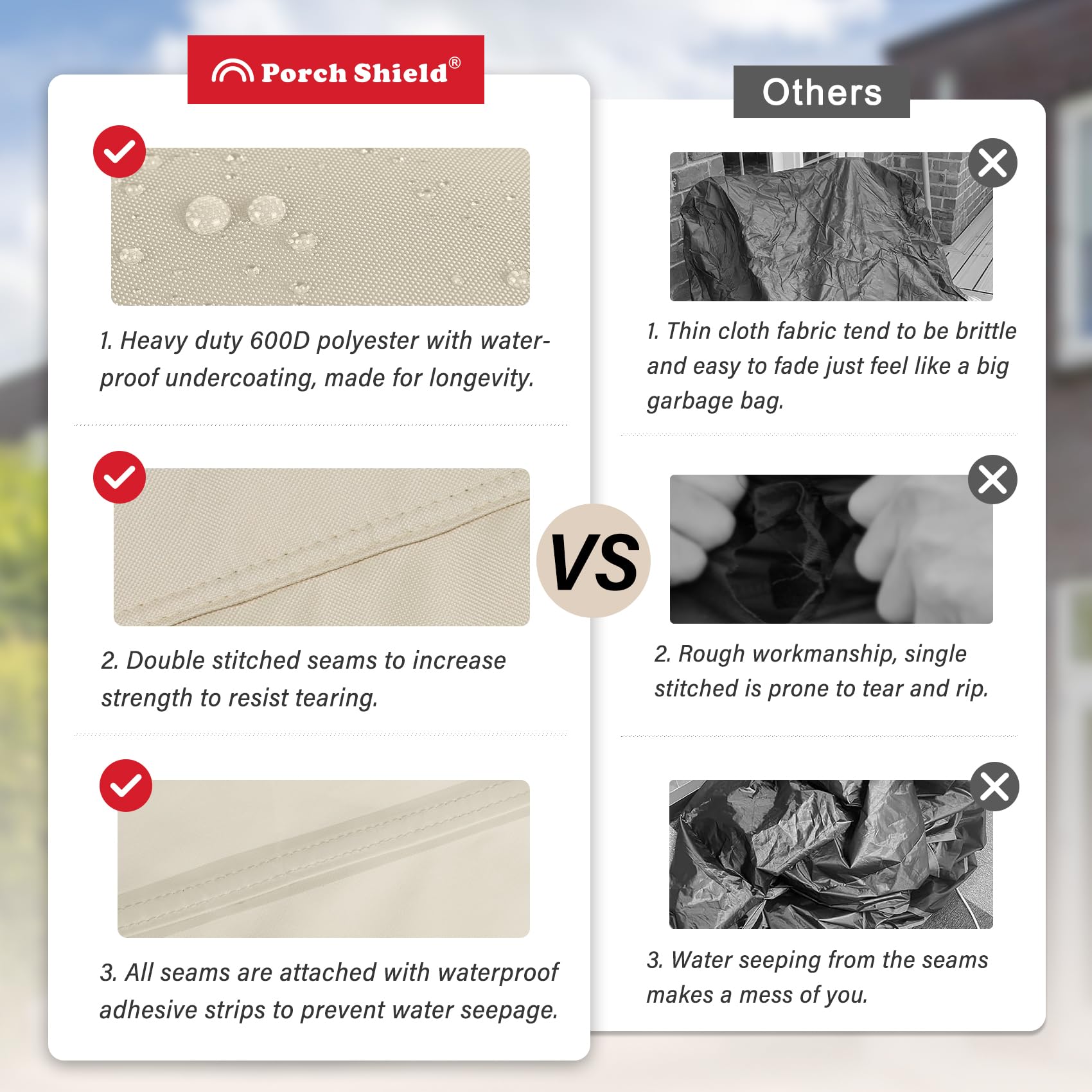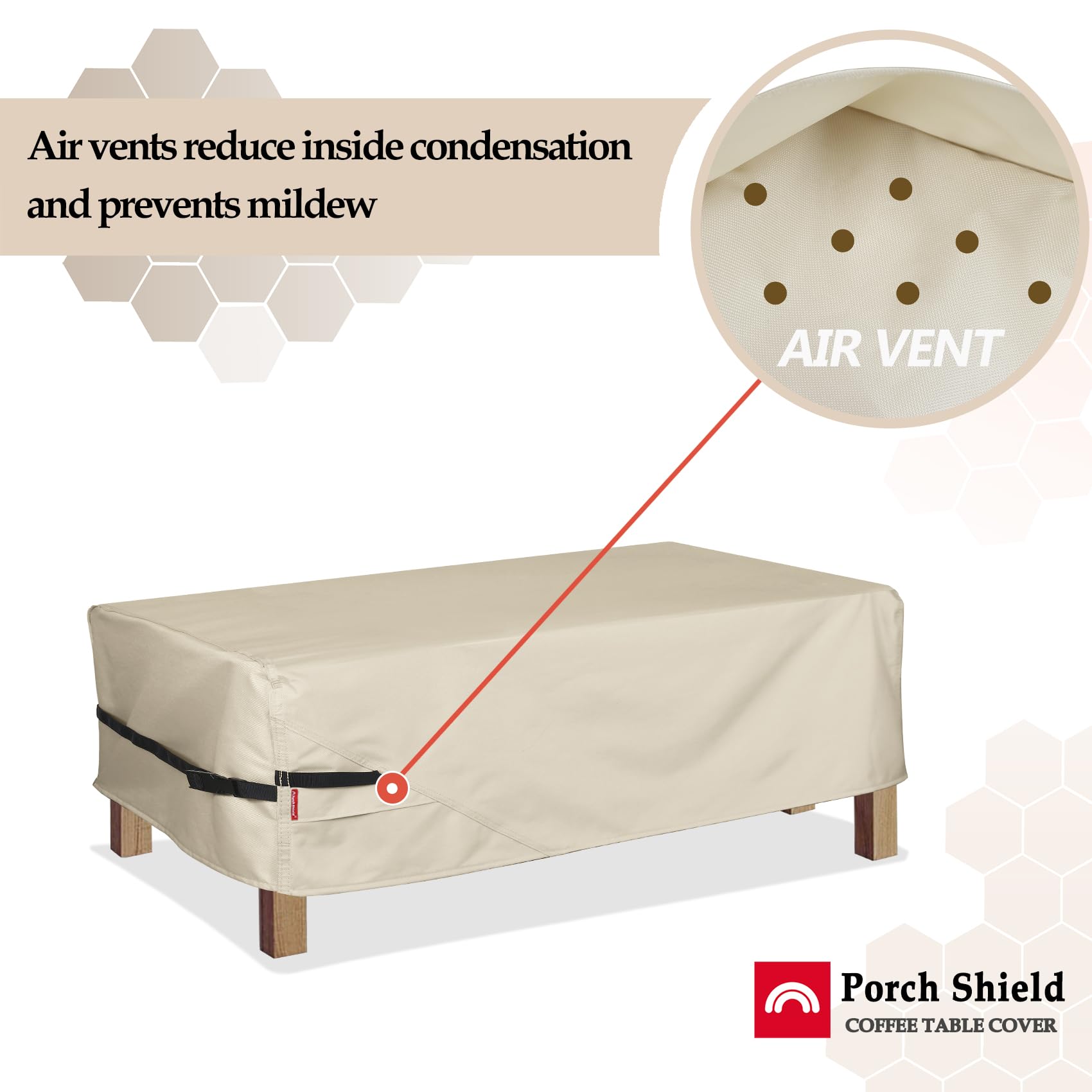 - Upgraded Material - If you have a problem with your patio furniture getting wet and dirty, the Porch Shield patio coffee table cover is a great alternative. It is made of 600D Polyester fabric with waterproof undercoating. Give your patio coffee table all around protection to against sun, rain, snow, wind, dust and dirt.