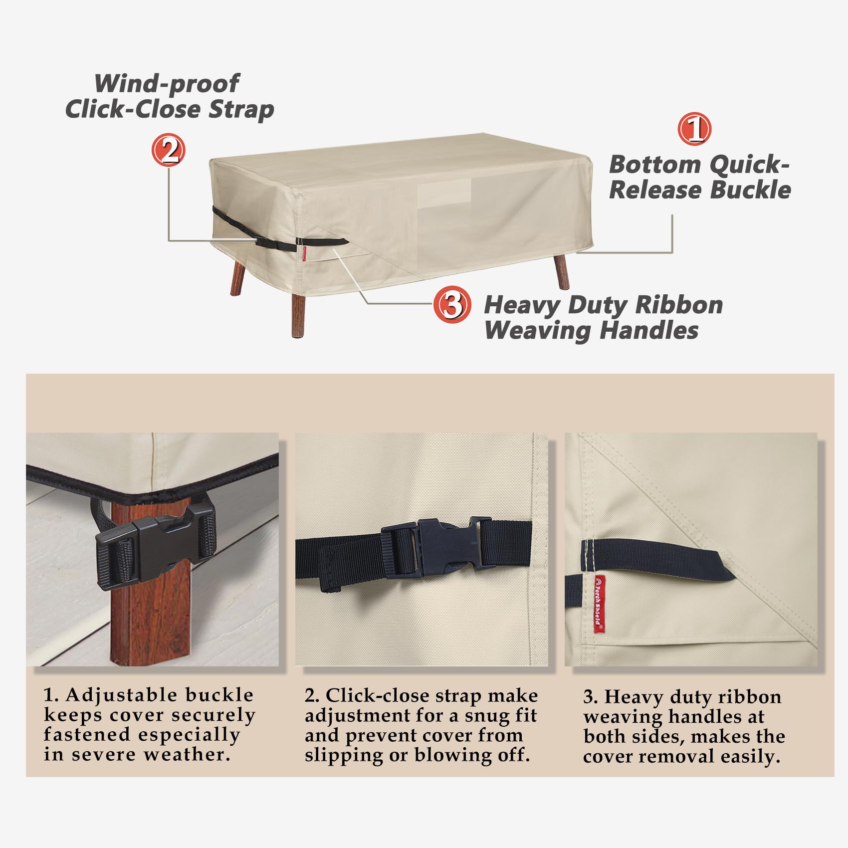 - Integrated Protection Systems - Click-close straps make adjustment for a snug fit. With 2 buckles at the bottom keep outdoor small table cover securely fastened and prevent cover from slipping or blowing off. Don't worry about internal condensation. Air vents at two sides have extra ventilation feature.