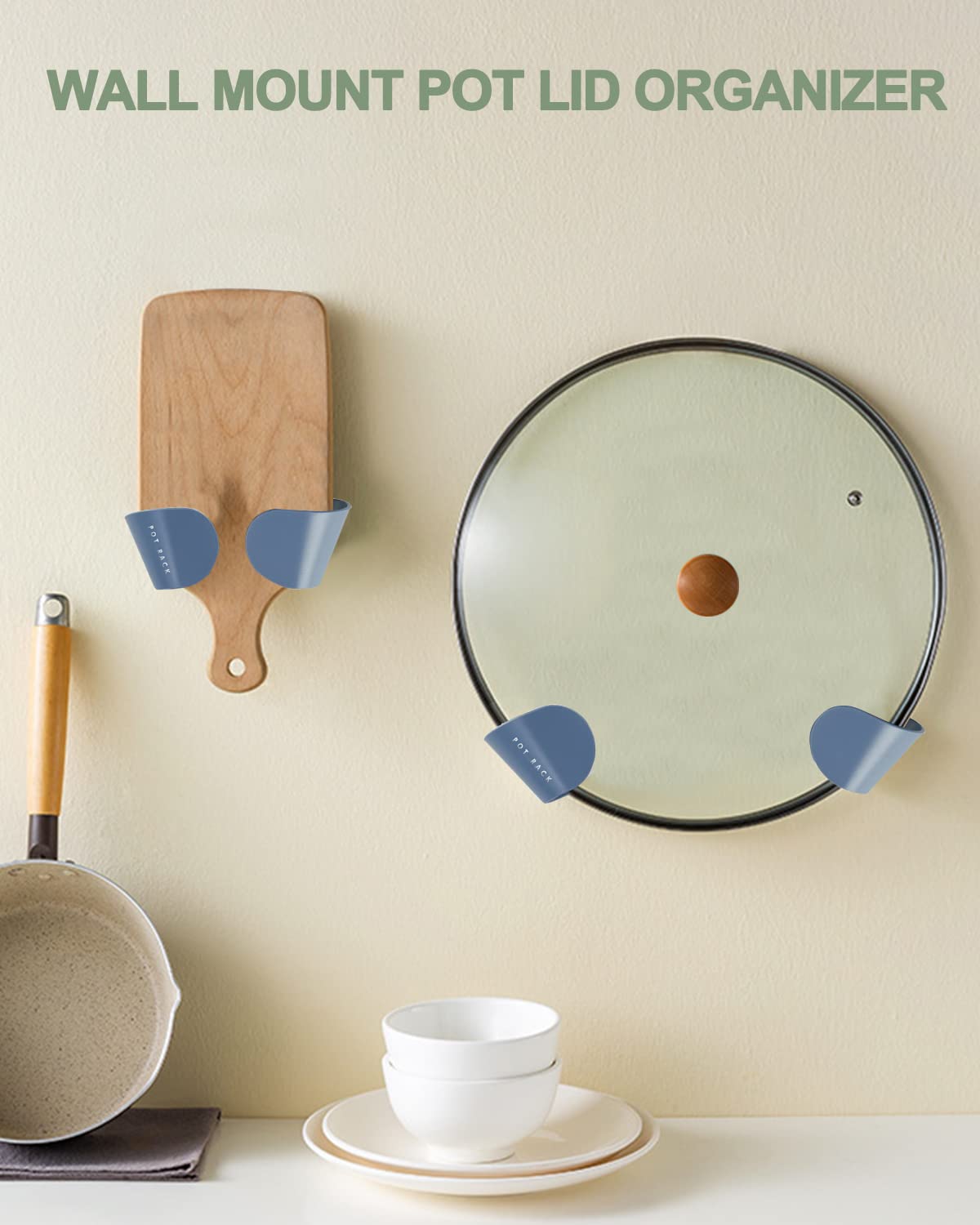 - Widely ApplicationThe pot lid holder is perfect for storing kitchen utensils such as cutting board, spatula, pot cover, dish, round tray and more. Make your kitchen look neater. Friendly Reminder: Please clean the wall or cabinet wall before use.