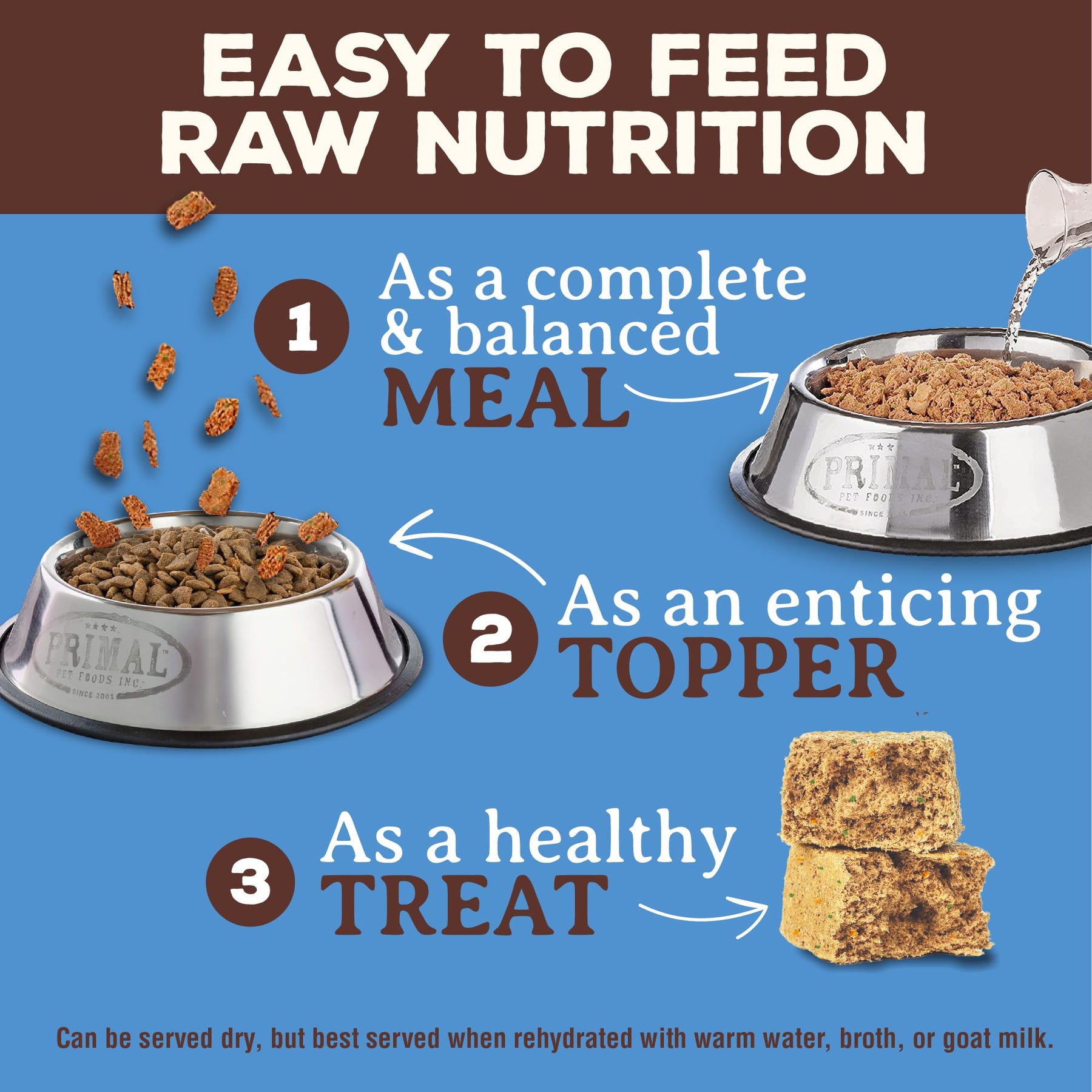 - Serve as a complete & balanced meal, a freeze dried dog food topper or treat. Adding Primal Pet Food just a few times a week will help you start to see the results raw food for dogs can provide