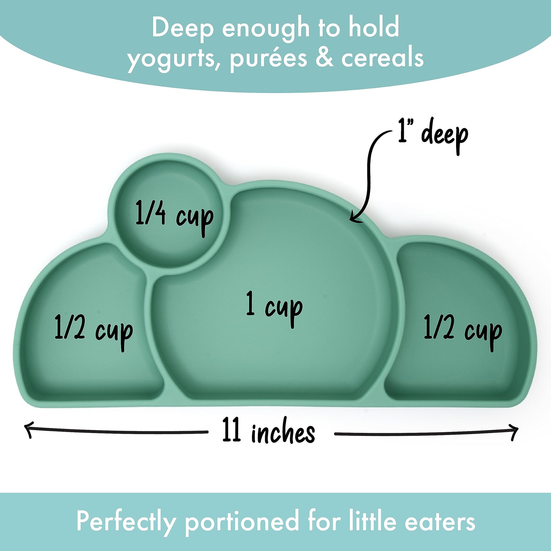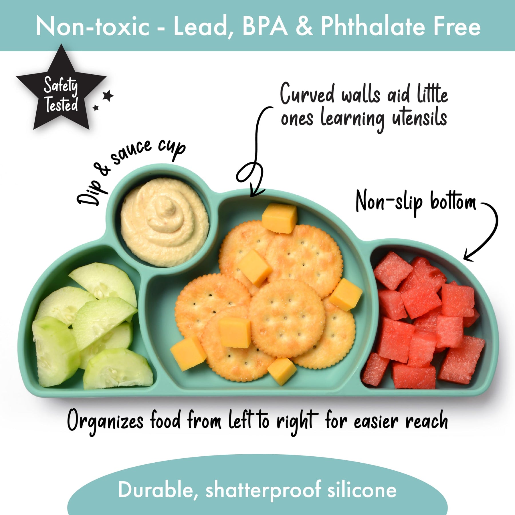 - SELF-FEEDING: Suction base is designed to keep plate in place and food off the floor for less mess at mealtime. Included Silicone Chew Spoon is soft, flexible and easy on sore gums on one end and has a soothing texture perfect for teething little ones on the other.