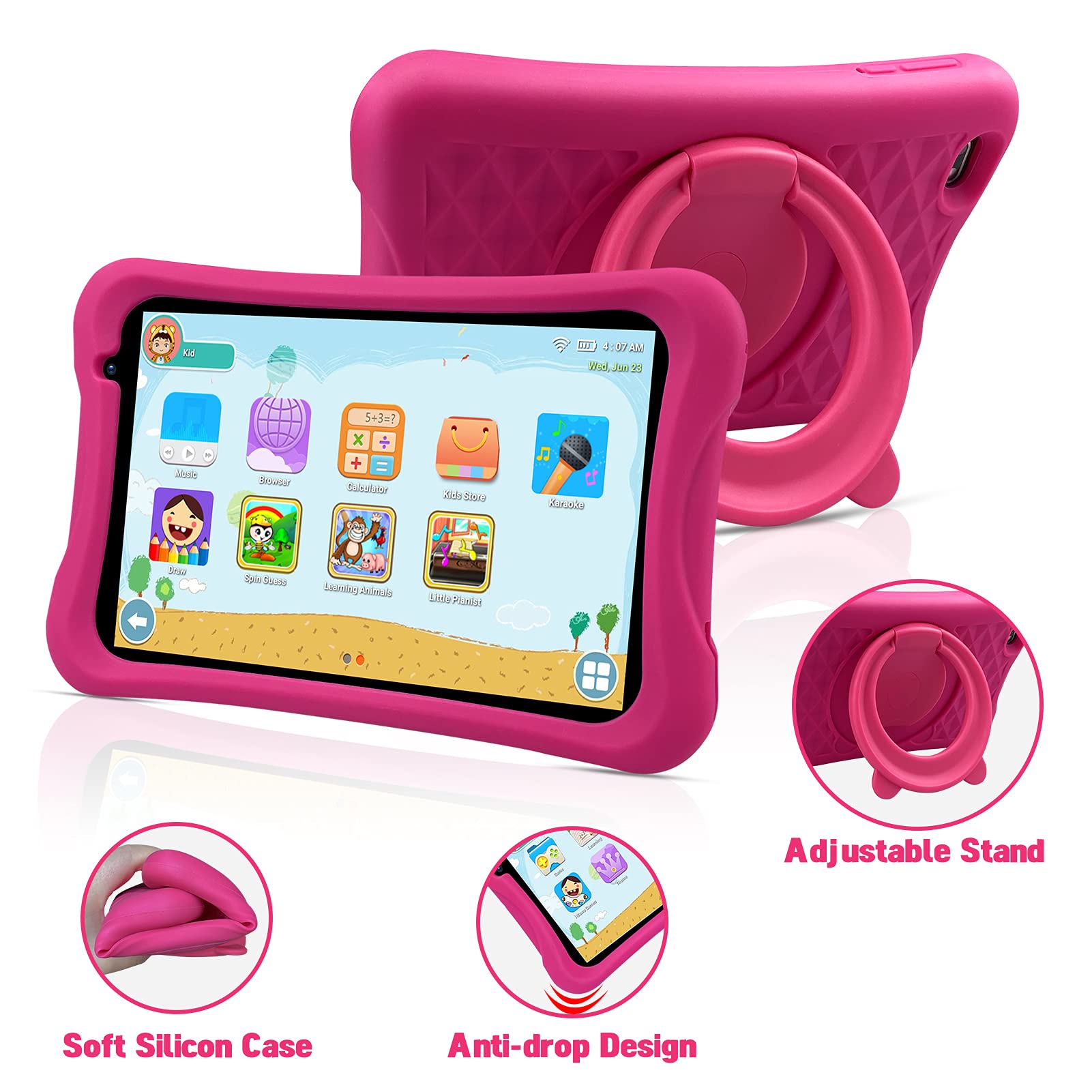 - [Durable and Protective Bumper Case] - Food-grade silicone case cover tablet nicely.Keeps falls and collisions away from tablet and protect kids.360-degree adjustable circle stand enables kids to get excellent viewing experience from all angles and makes it easy to carry.