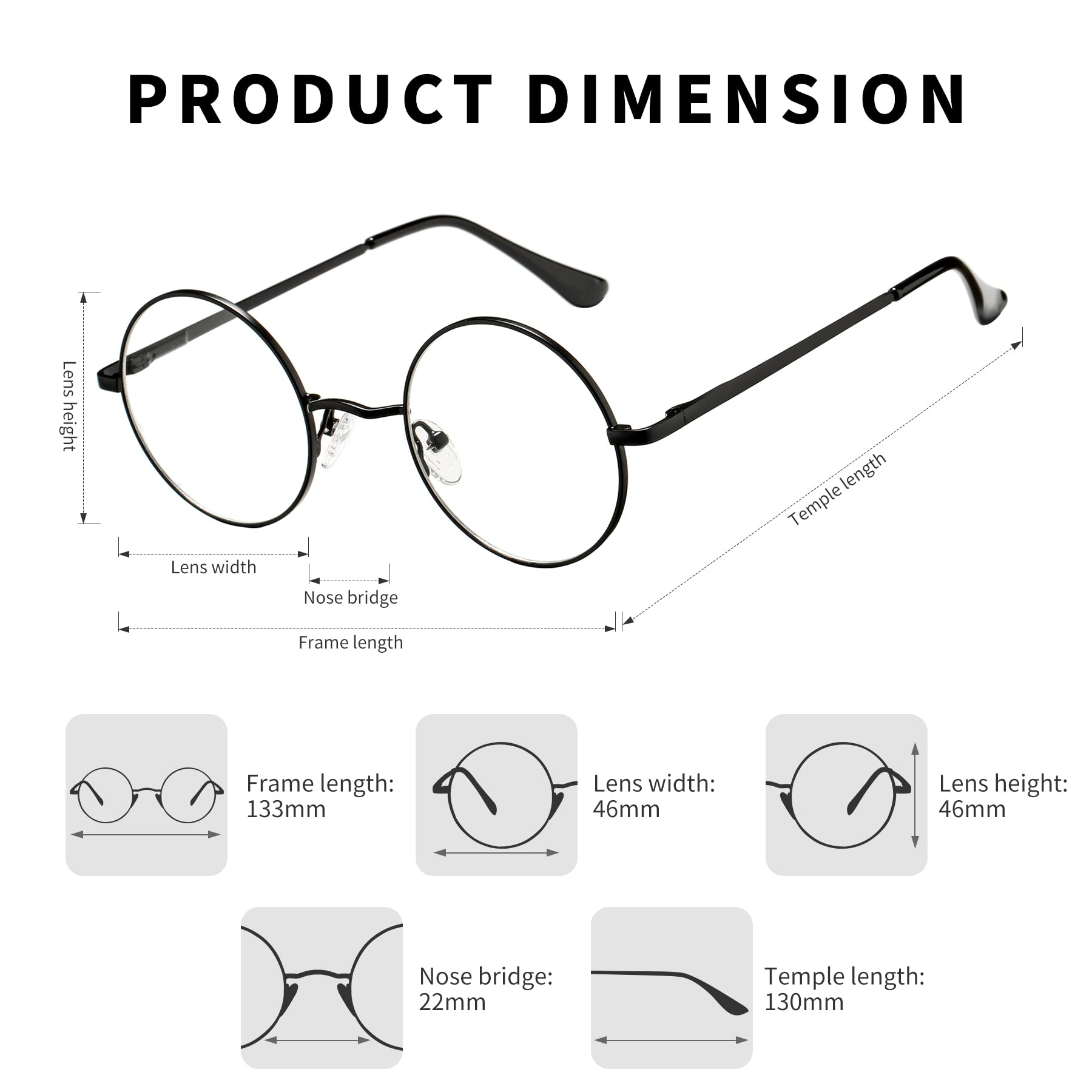 - PRODUCT DIMENSION:Lens Width: 46 mm/1.81 inches Frame Height: 46 mm/1.81 inches Nose Bridge: 22 mm/0.87 inches Frame Length: 133 mm/5.24 inches Temple Length: 130 mm/5.11 inches