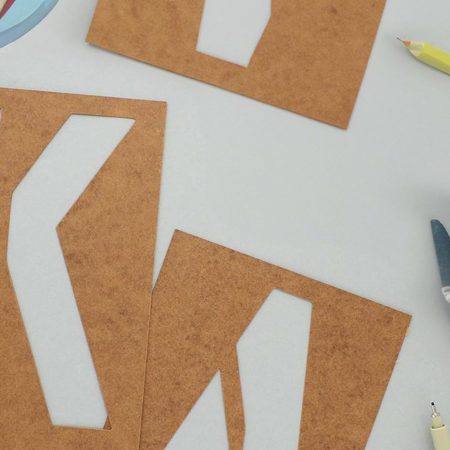 - Reusable, heavy, precut stencils on individual sheets with large borders for customized letter spacing.